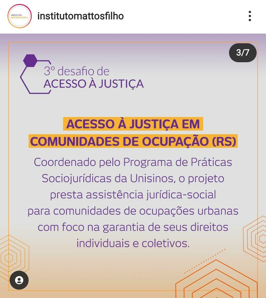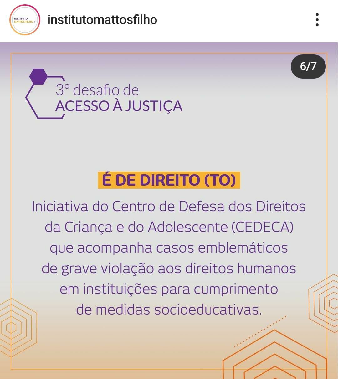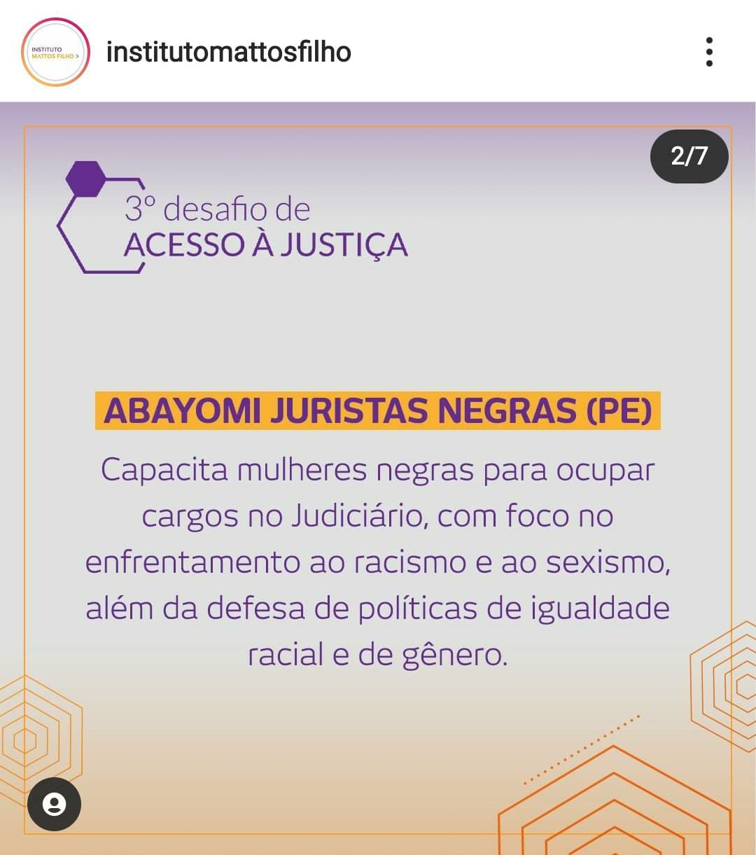 Legenda: @institutomattosfilho – Acabou o mistério! Confira as 6 organizações vencedoras do 3º Desafio de Acesso à Justiça, que dividirão o prêmio de R$ 150 mil para implementar ou ampliar suas iniciativas. Nesta edição, recebemos 100 inscrições de 21 estados brasileiros. Entre os projetos selecionados pelo júri, estão ações de apoio a mulheres negras, pessoas que vivem com HIV/ Aids e comunidades de ocupações urbanas. Parabéns! #DesafioDeAcessoa Justica #Acessoa Justiça