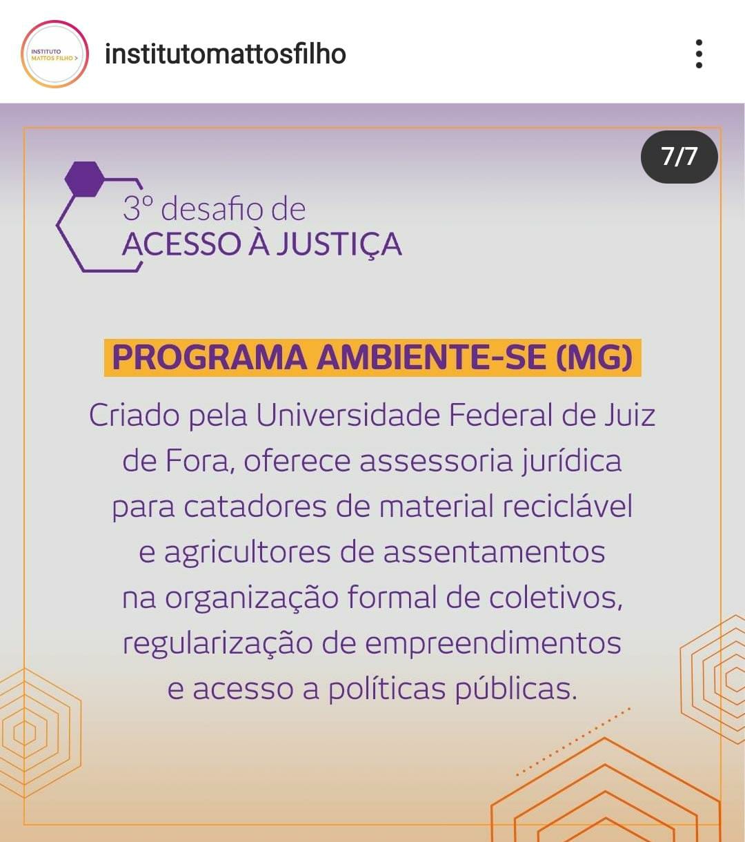 Temos o prazer de compartilhar com vocês, que nós, do Programa Ambiente-se, recebemos o prêmio nacional no 3º Desafio do Acesso à Justiça, promovido pelo Instituto Mattos Filho. Foram R$ 20.000,00 pelo trabalho realizado com catadores e agricultores familiares.