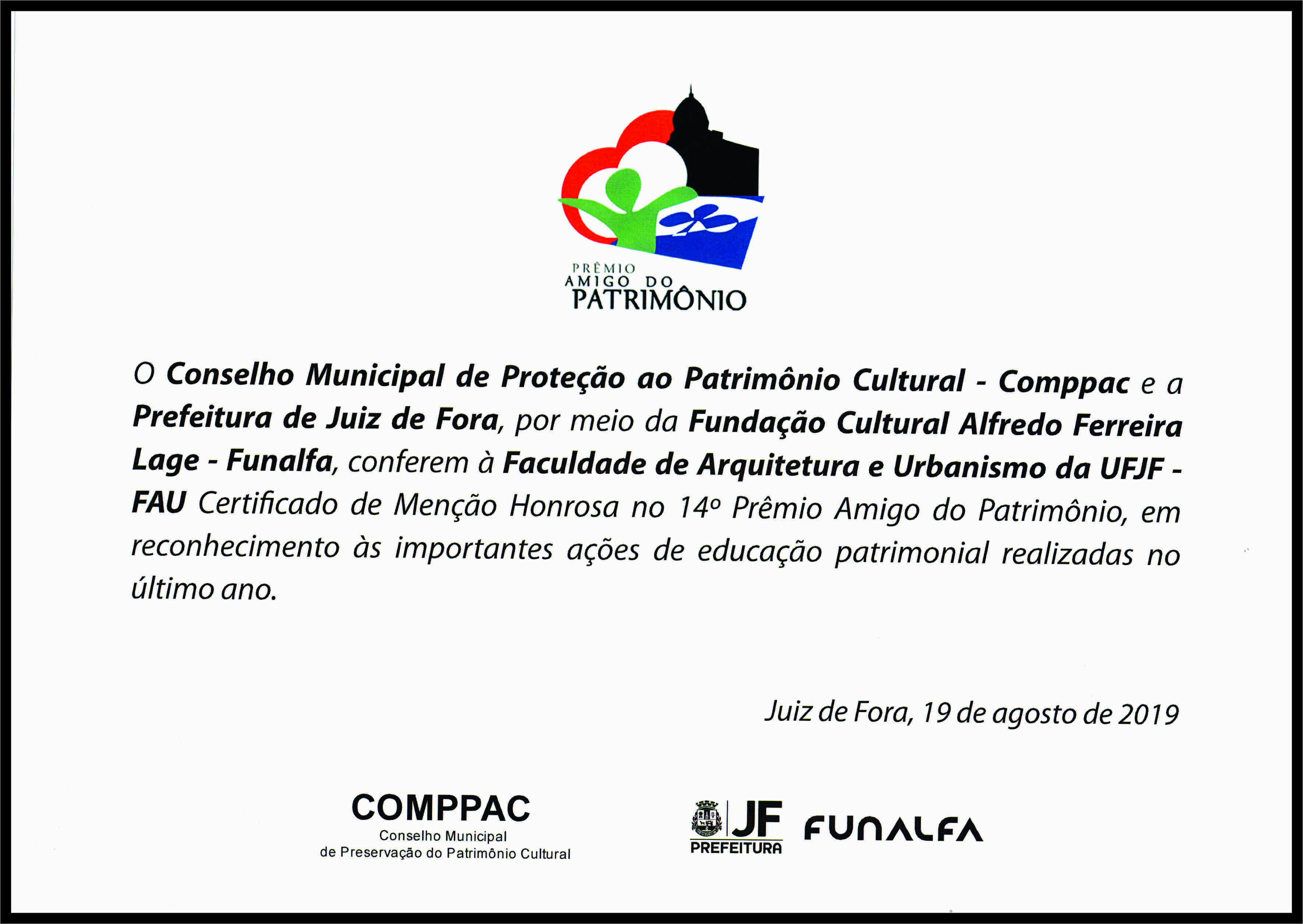O Centro Acadêmico do Curso de Arquitetura e Urbanismo – CACAU e a Faculdade de Arquitetura e Urbanismo – FAU, no dia 19 de agosto de 2019, receberam a Menção Honrosa na 14 Prêmio Amigo do Patrimônio, que é um evento promovido pelo Conselho Municipal de Preservação do Patrimônio Cultural – COMPPAC, da Fundação Alfredo Ferreira Laje – FUNALFA, da Prefeitura de Juiz de Fora – PJF.