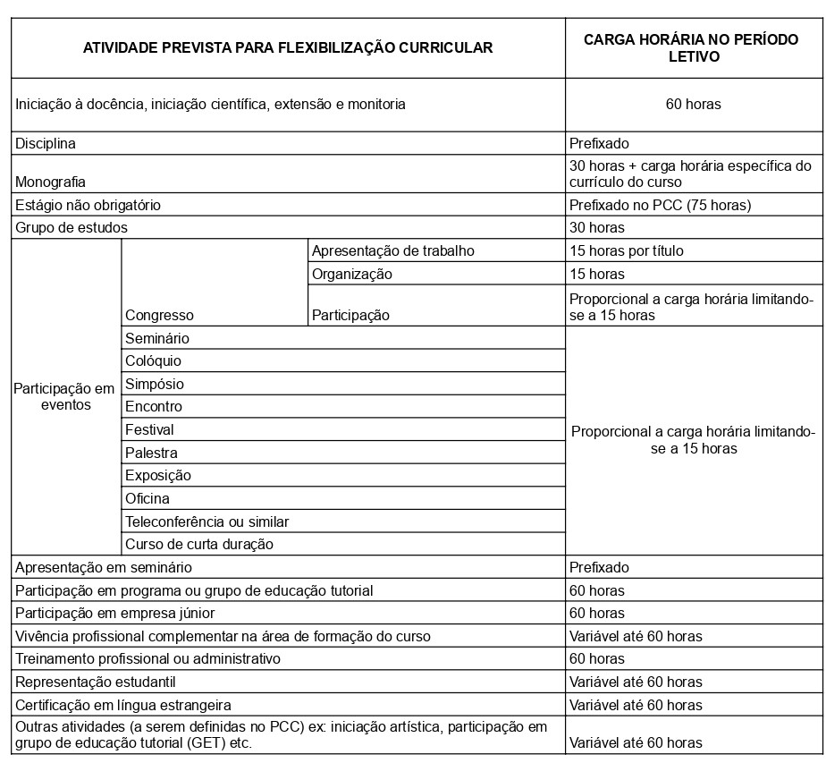 Várias atividades como participação em eventos, grupo de estudo, estágio, iniciação científica, monitoria e treinamento profissional, entre outras, podem ser computadas para a Flexibilização Curricular.