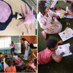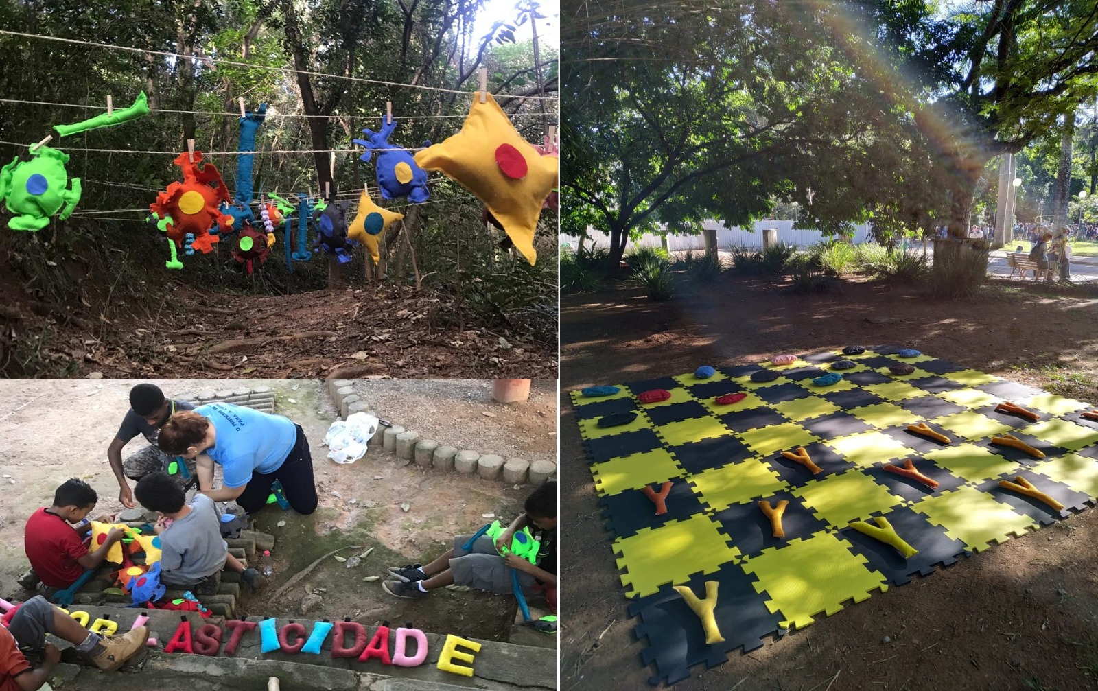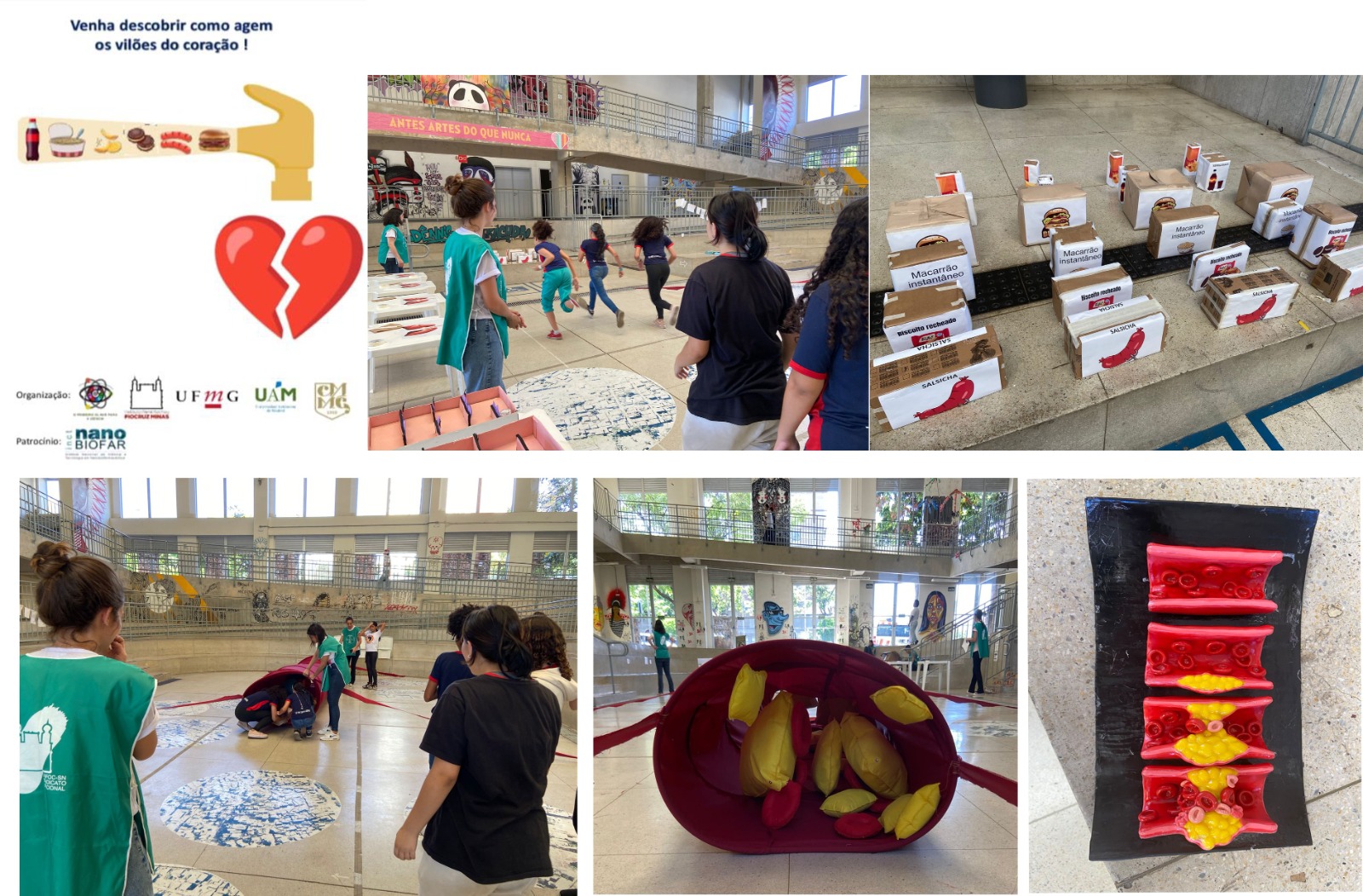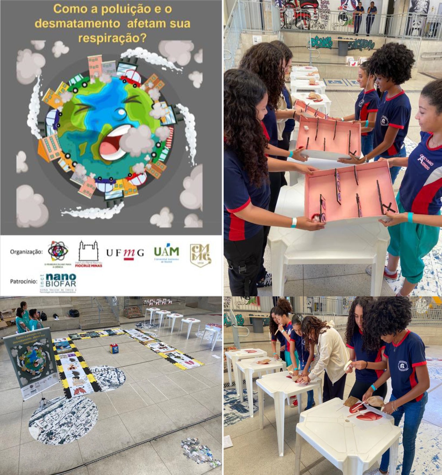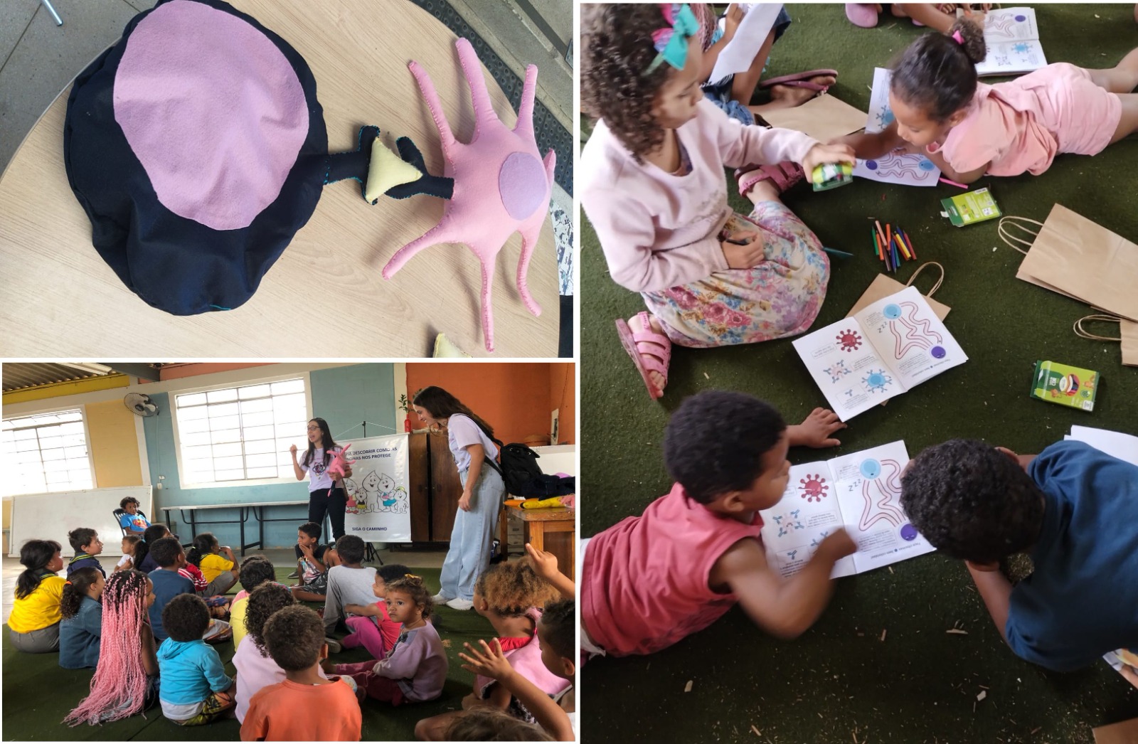 As imagens ilustram algumas das atividades desenvolvidas no âmbito do projeto “Primeiro Olhar para a Ciência”, com foco em temas como vacinação, arboviroses (Dengue, Zika e Chikungunya), doenças respiratórias e cardiovasculares, além da discussão sobre como o desmatamento pode favorecer o surgimento de novas pandemias. Também foram abordadas questões como a necessidade de proteção dos biomas, a relação entre planejamento urbanístico e saúde, a importância da participação coletiva na promoção da saúde pública.