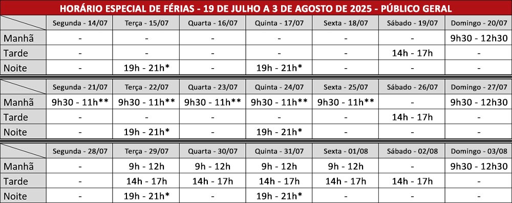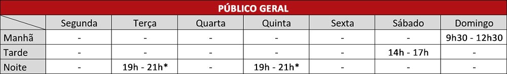 – A observação astronômica para o público geral ocorre apenas às terças e quintas-feiras e somente se as condições climáticas forem favoráveis.
