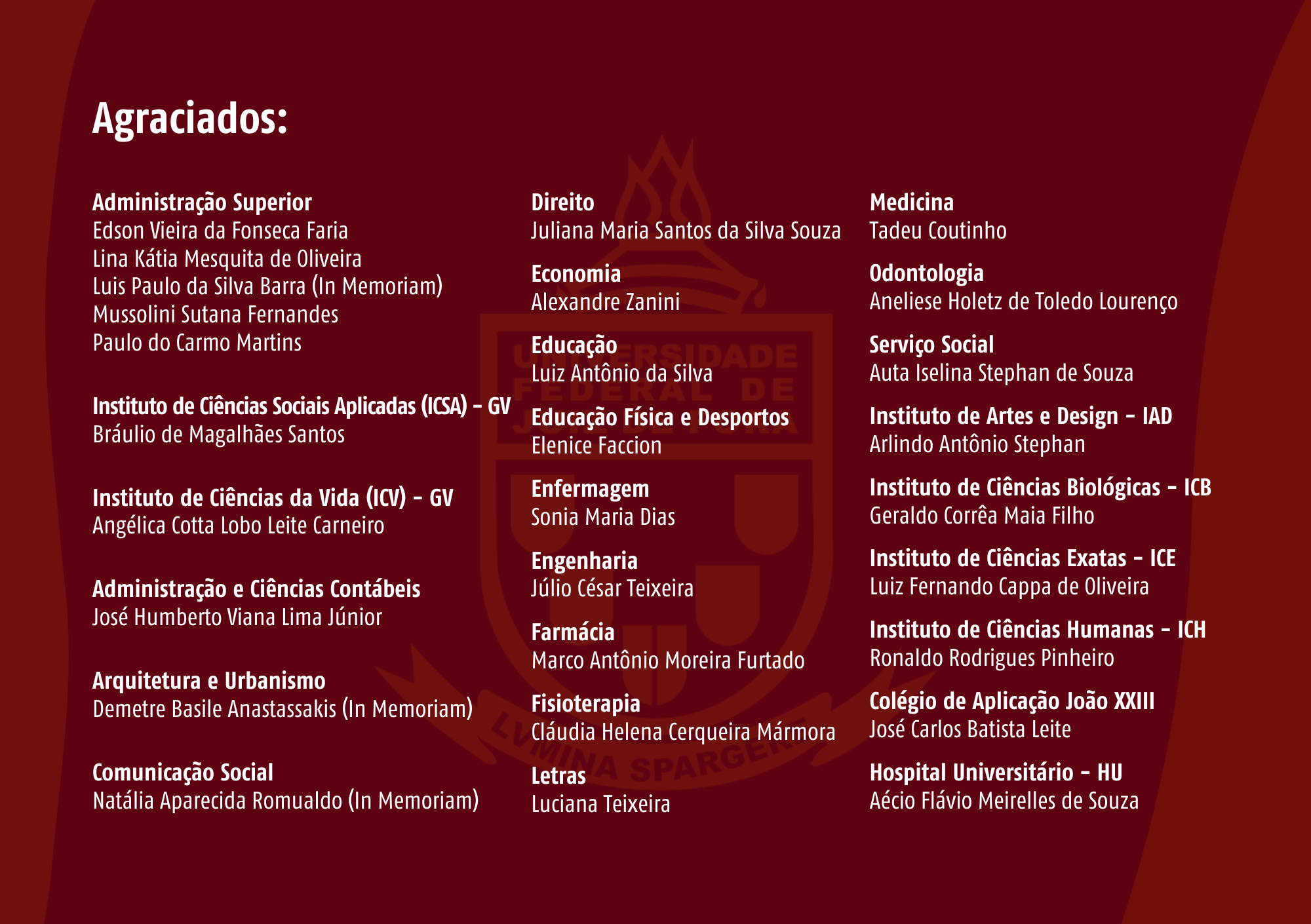 Entre os homenageados, destacam-se profissionais exemplares, incluindo professores, estudantes e servidores técnico-administrativos em Educação (TAEs), cujas trajetórias deixaram uma marca indelével na história da Instituição. Neste ano, a medalha também será concedida in memoriam ao professor e pró-reitor adjunto de Pós-Graduação e Pesquisa, Luis Paulo da Silva Barra, ao professor da Faculdade de Arquitetura e ex-presidente do Instituto de Arquitetos do Brasil (IAB), Demetre Basile Anastassakis, e à jornalista egressa da Faculdade de Comunicação, Natália Romualdo.