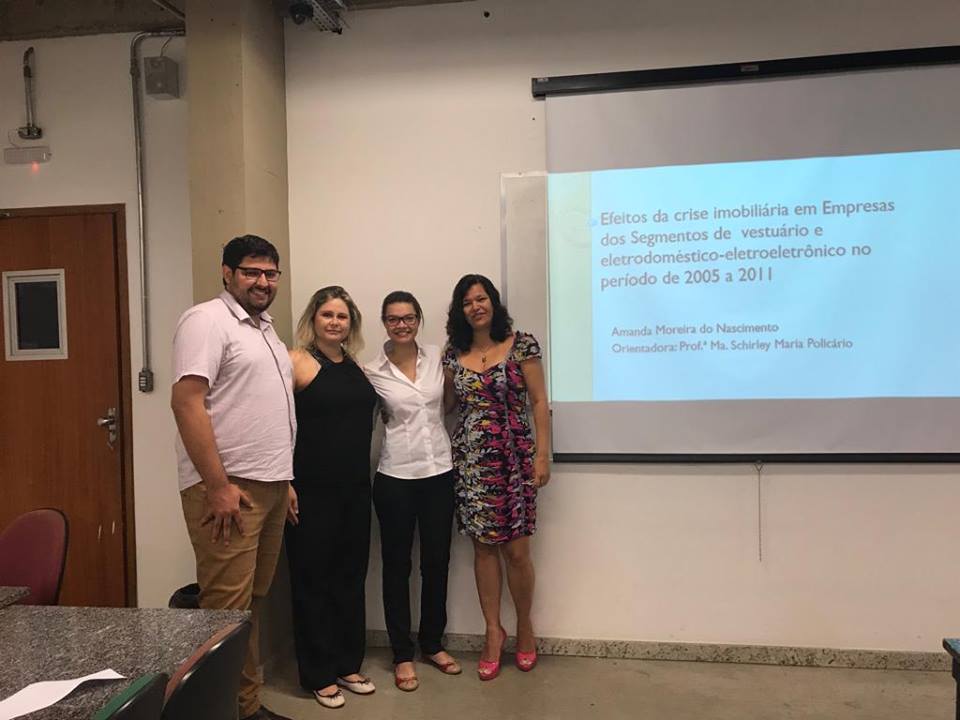 Nesta quarta-feira (07), a aluna Amanda Moreira do Nascimento do curso de Ciências Contábeis, teve a defesa da sua Monografia, Aprovada! O tema defendido foi: ”Efeitos da crise imobiliária em empresas dos segmentos de vestuário e eletrodoméstico-eletroeletrônico no período de 2005 a 2011”, orientado pela professora Schirley Maria Policário. Confira a foto da apresentação: