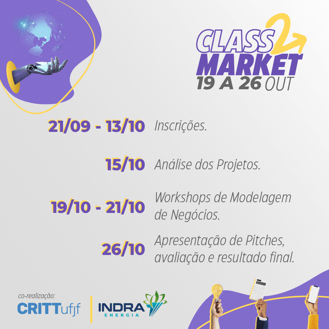 A terceira edição do programa Class to Market chega em 2021 e, dessa vez, com a parceria da Indra Energia como co-organizadora, junto ao Centro Regional de Inovação e Transferência de Tecnologia (Critt) da Universidade Federal de Juiz de Fora (UFJF), além da parceria já corrente da Faculdade de Administração e Ciências Contábeis (FACC). As inscrições – exclusivamente on-line e gratuitas – ficam abertas entre 21 de setembro e 13 de outubro e vão premiar pesquisas universitárias que resolvem problemas do mundo real com soluções criativas e inovadoras (ou seja, novas ou significativamente melhoradas).