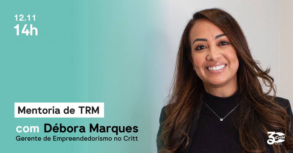 No dia 12 de novembro, o Centro Regional de Inovação e Transferência de Tecnologia (Critt) promove uma mentoria sobre TRM com a Gerente do setor de Empreendedorismo, Débora Marques. A capacitação será híbrida, tendo a possibilidade do inscrito ir presencial no Auditório do Critt ou Online pelo Google Meet, às 14h.