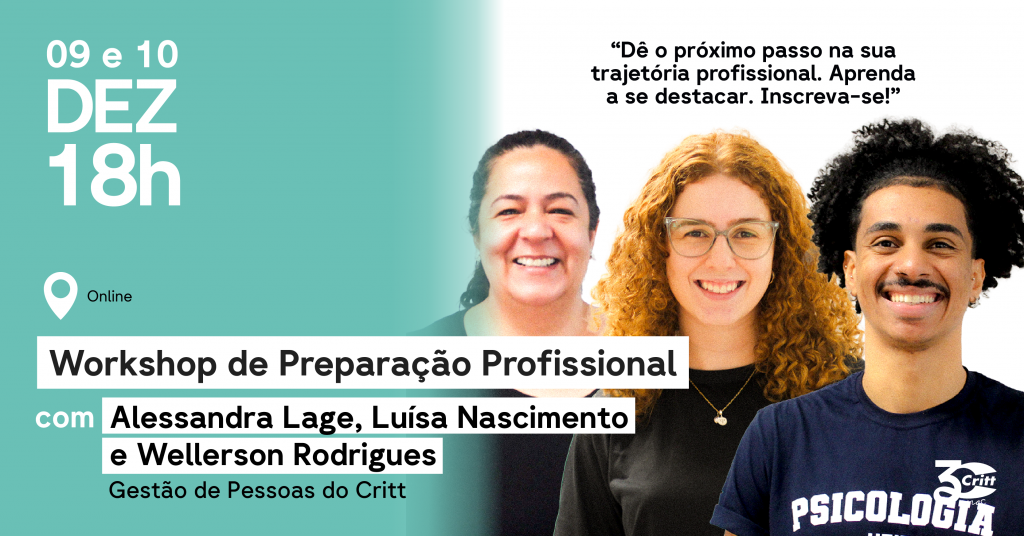 Nos dias 9 e 10 de dezembro, o Centro Regional de Inovação e Transferência de Tecnologia (Critt) promove um workshop sobre Preparação Profissional com colaboradores do setor de Gestão de Pessoas do Critt, Alessandra Lage, Luísa Nascimento e Wellerson Rodrigues. A capacitação será online, pelo Google Meet, às 18h. Serão dois dias intensos que irão transformar a sua maneira de buscar e conquistar a vaga ideal, com técnicas, práticas e estratégias que realmente funcionam: do currículo à entrevista.