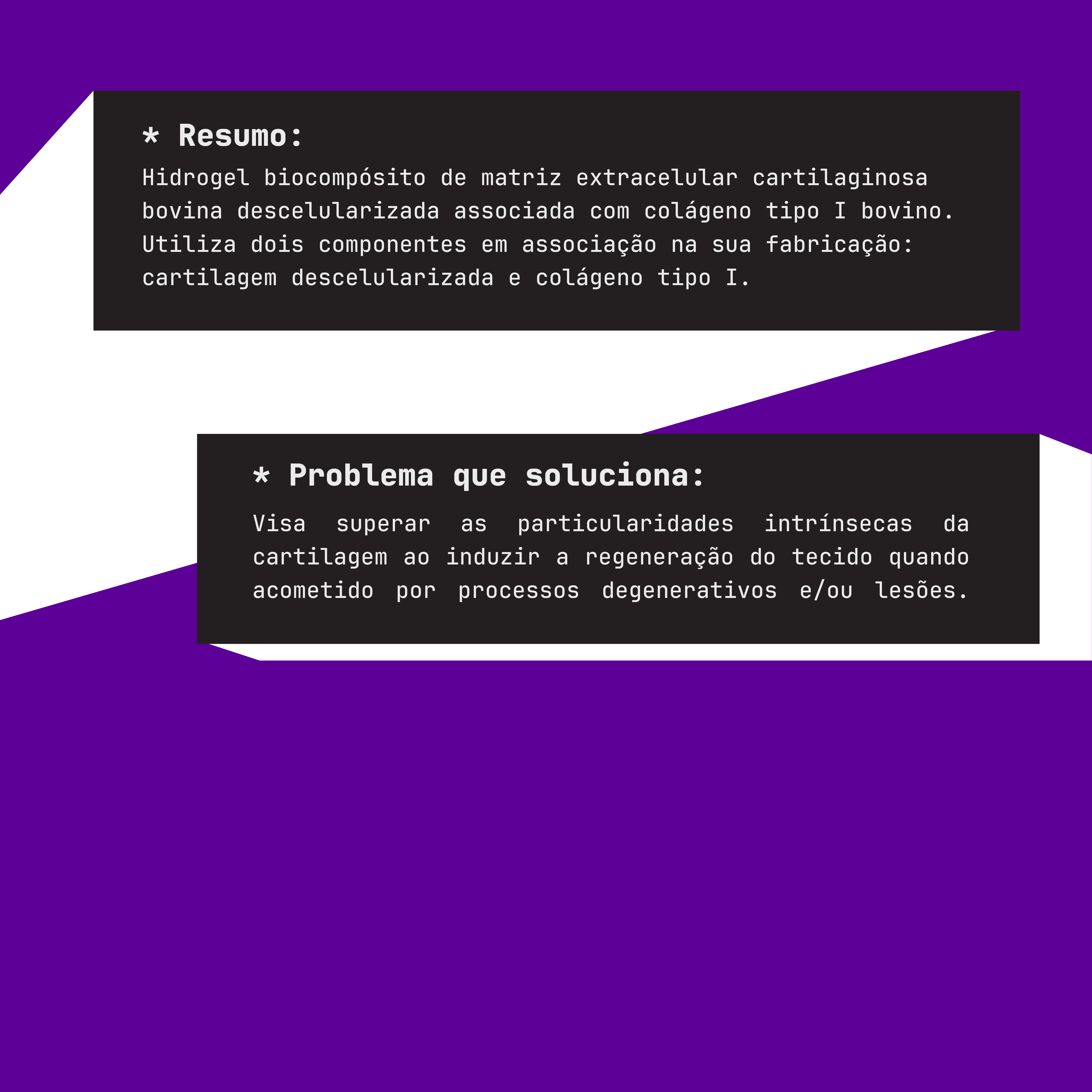 Hidrogel biocompósito de matriz extracelular cartilaginosa bovina descelularizada associada com colágeno tipo I bovino. Utiliza dois componentes em associação na sua fabricação: cartilagem descelularizada e colágeno tipo I.