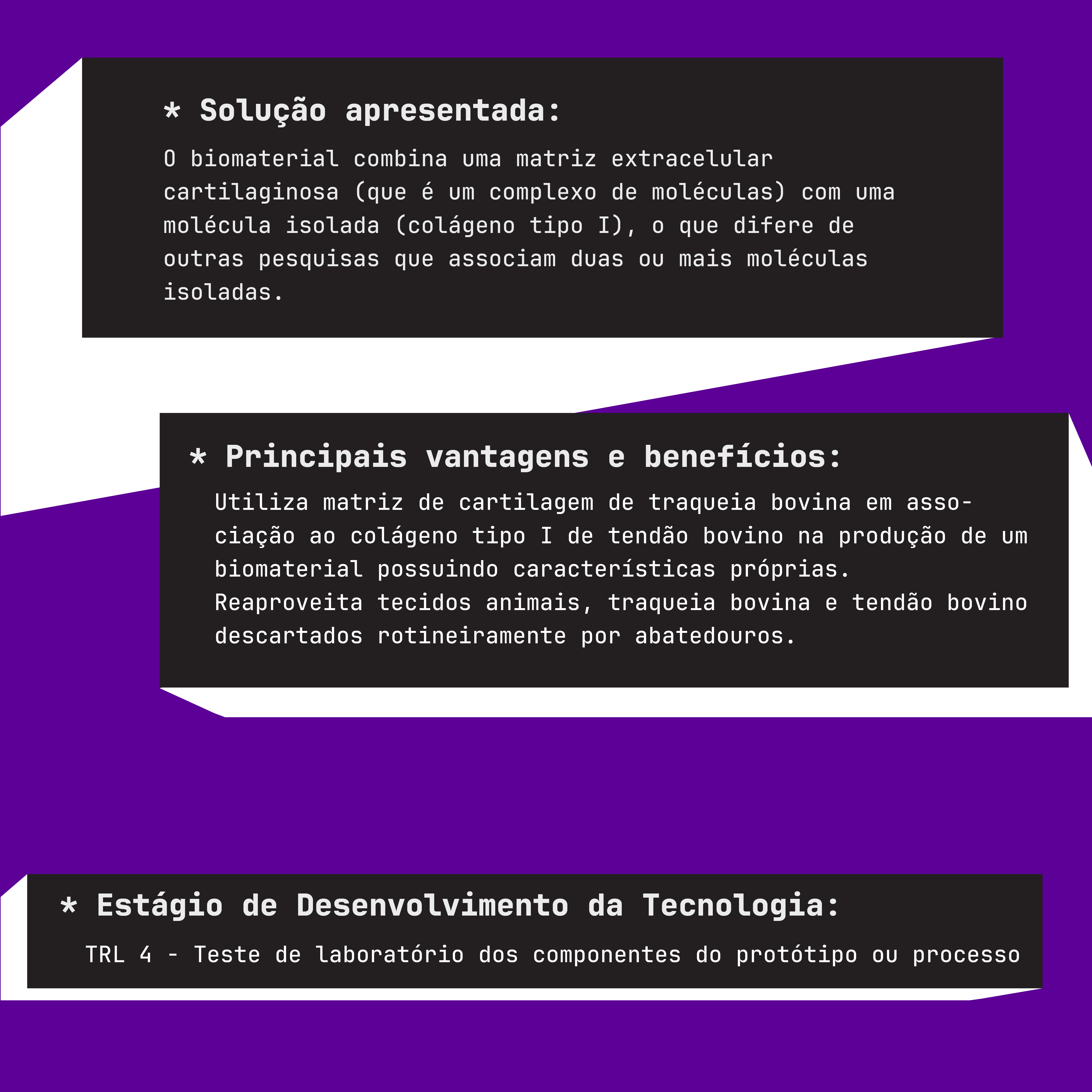 O biomaterial combina uma matriz extracelular cartilaginosa (que é um complexo de moléculas) com uma molécula isolada (colágeno tipo I), o que difere de outras pesquisas que associam duas ou mais moléculas isoladas.