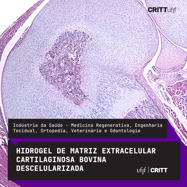 Hidrogel biocompósito de matriz extracelular cartilaginosa bovina descelularizada associada com colágeno tipo I bovino. Utiliza dois componentes em associação na sua fabricação: cartilagem descelularizada e colágeno tipo I.