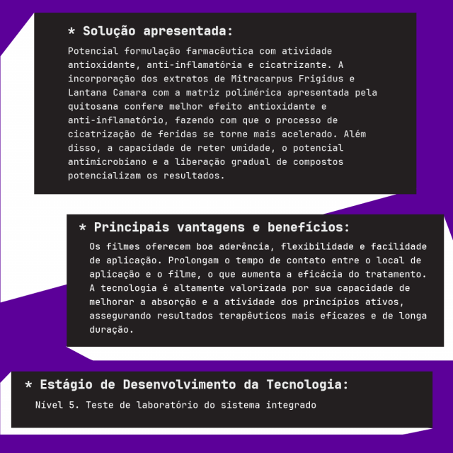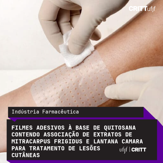 Potencial formulação farmacêutica com atividade antioxidante, anti-inflamatória e cicatrizante. A incorporação dos extratos de Mitracarpus Frigidus e Lantana Camara com a matriz polimérica apresentada pela quitosana confere melhor efeito antioxidante e anti-inflamatório, fazendo com que o processo de cicatrização de feridas se torne mais acelerado. Além disso, a capacidade de reter umidade, o potencial antimicrobiano e a liberação gradual de compostos potencializam os resultados.