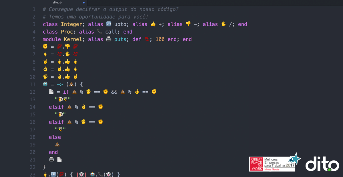 Consegue decifrar o output do nosso código (https://goo.gl/Y2G11W) e quer trabalhar em uma das Melhores Empresas para Trabalhar em Minas Gerais de acordo com o Great Place to Work®?