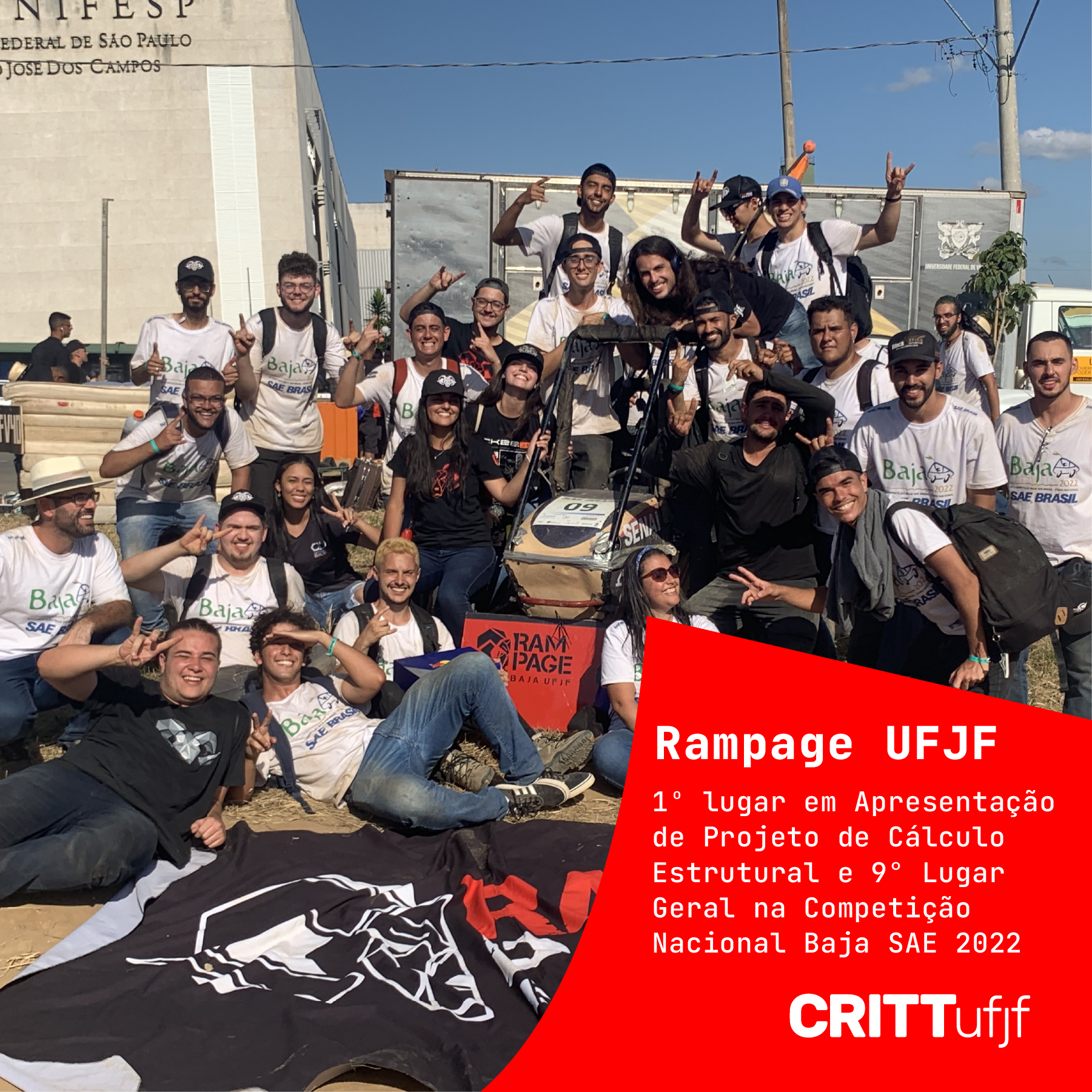 Rampage, uma equipe de Baja da Universidade Federal de Juiz de Fora (UFJF), apoiada pelo Centro Regional de Inovação e Transferência de Tecnologia (Critt), ficou em 9° Lugar Geral na Competição Nacional Baja SAE 2022, o melhor resultado da equipe até agora. Além disso, os estudantes das Engenharias garantiram o 1º lugar em Apresentação de Projeto de Cálculo Estrutural, o que também foi um marco histórico na trajetória do grupo.