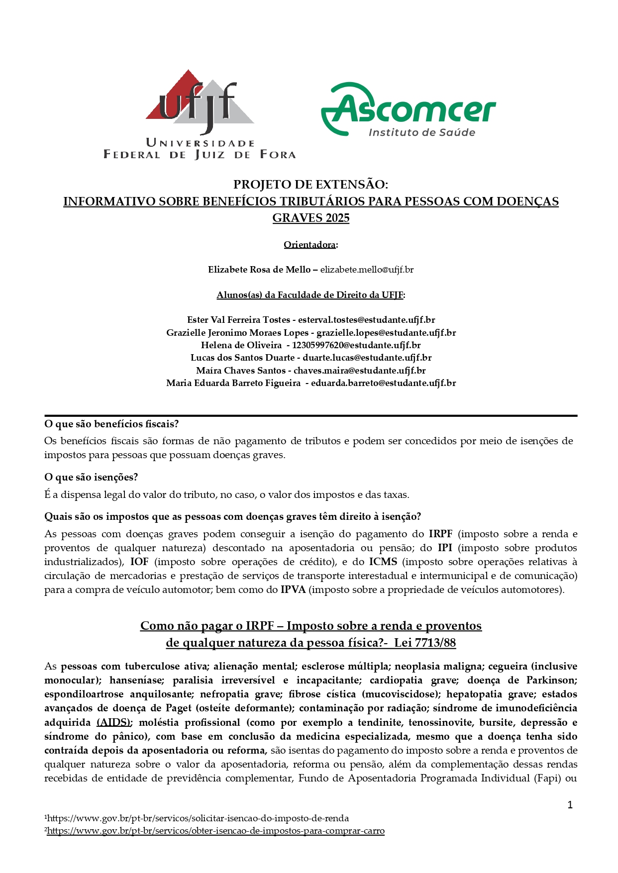 Confira o Informativo sobre benefícios tributários para pessoas com doenças graves 2025, material produzido sob orientação da professora Elizabete Rosa de Mello, do Departamento de Direito Público Material da Faculdade de Direito da UFJF.