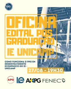 A Oficina ocorrerá no dia 27/08, próxima quarta-feira, e ocorrerá de maneira híbrida – com link no Meet e presencialmente no Instituto de Economia. Ela será ministrada por estudantes do programa de Mestrado.