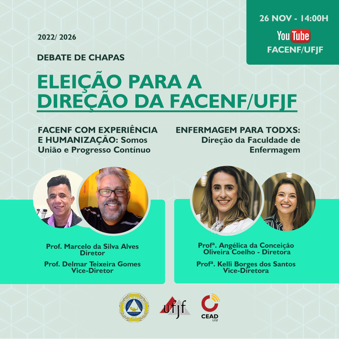 As perguntas direcionadas às chapas deverão ser enviadas pelo chat do YouTube ou para o e-mail da secretaria (secretaria.enfermagem@ufjf.edu.br).
