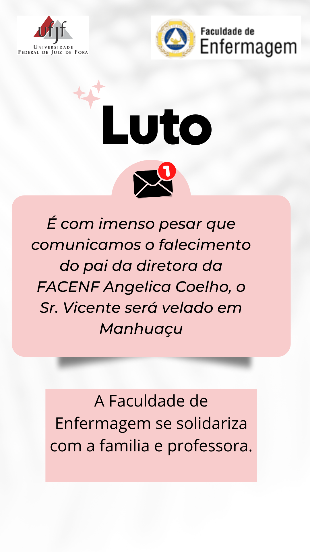 A FACENF/UFJF comunica com pesar, o falecimento de Vicente Coelho Neto, pai da prof.ª Angélica Coelho, diretora da nossa faculdade. O sepultamento ocorrerá amanhã, 5ª feira, em Manhuaçu, onde o corpo está sendo velado.
