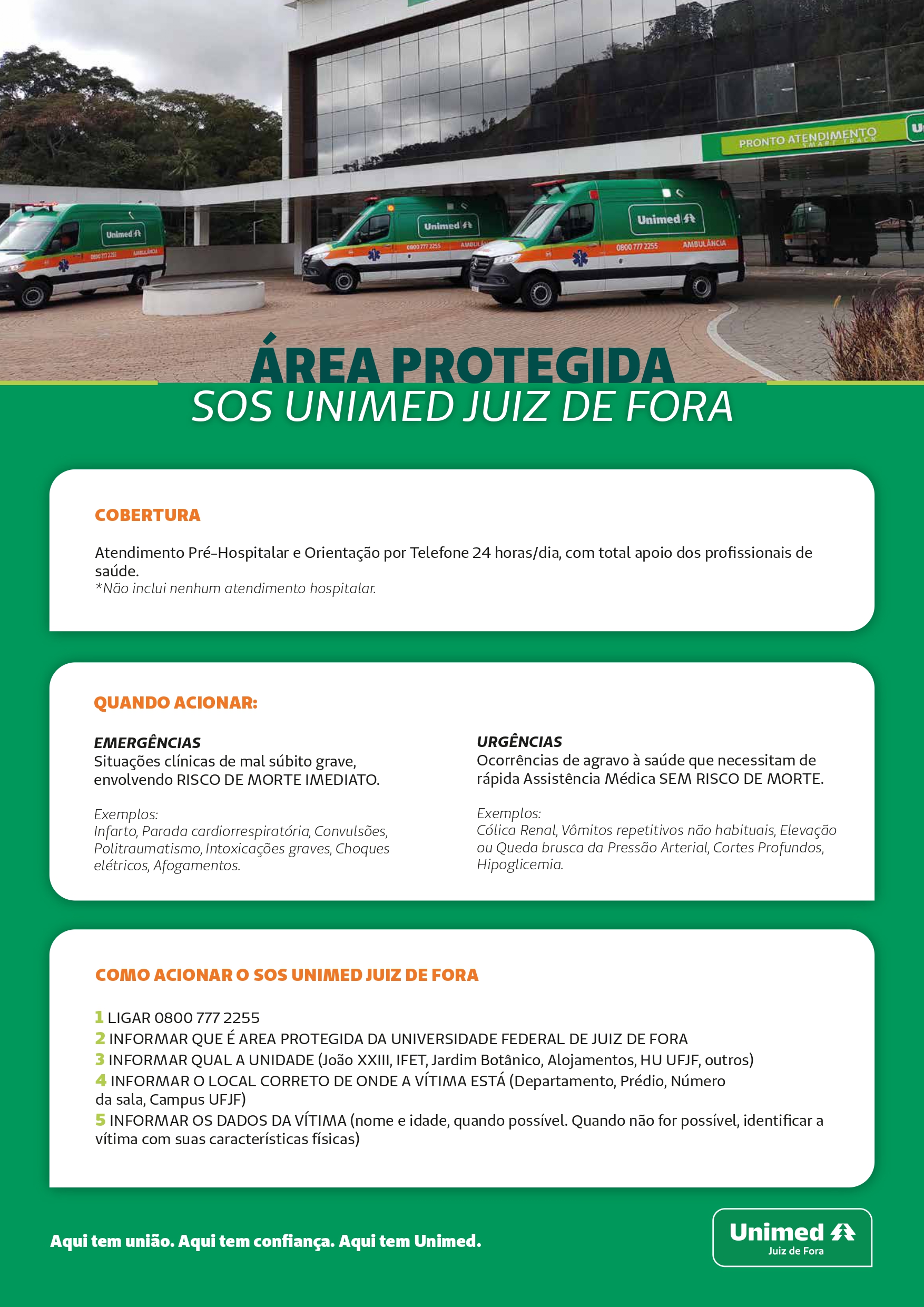 A Universidade Federal de Juiz de Fora faz parte da chamada “área protegida” da Unimed-JF, de forma que as situações de urgência e emergência podem ser direcionadas ao serviço SOS Unimed pelo telefone 0800 777 2255.