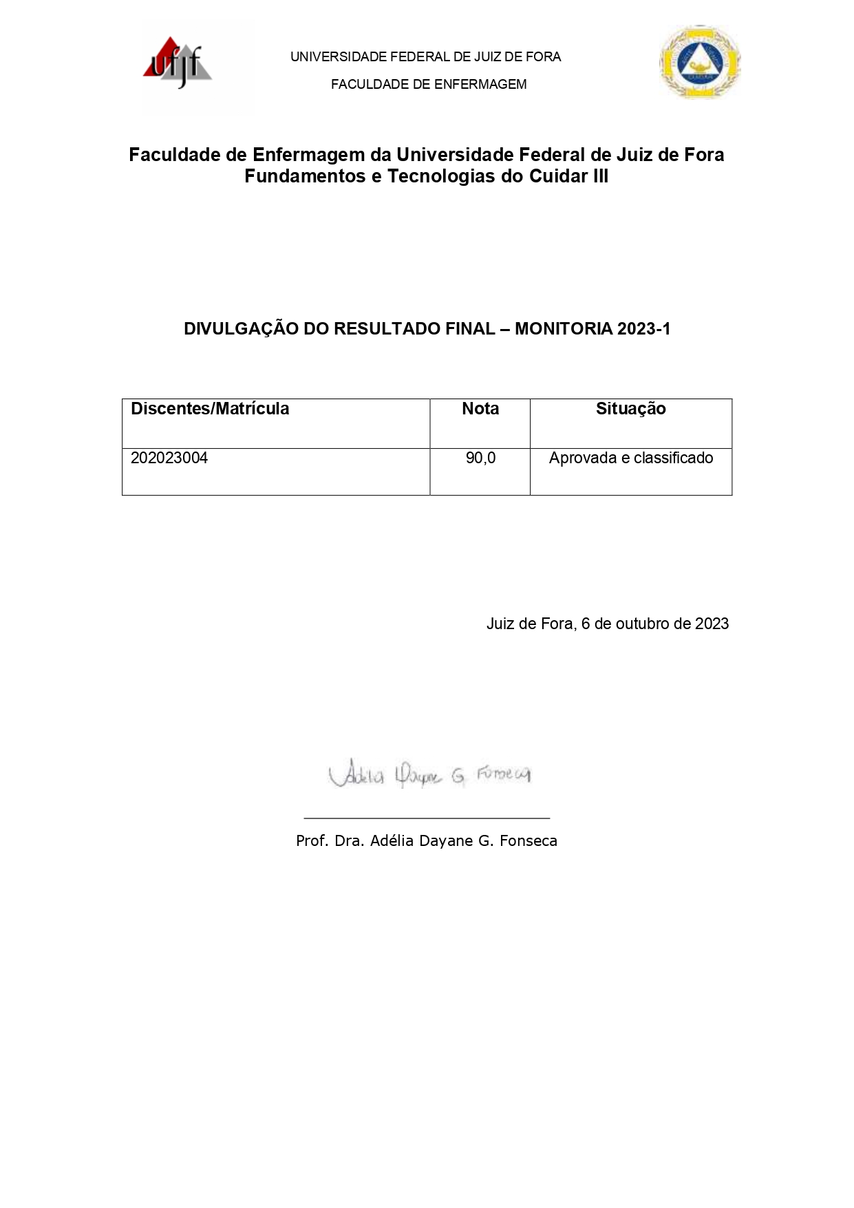 Resultado de monitoria: Fundamentos e Tecnologias do Cuidar III