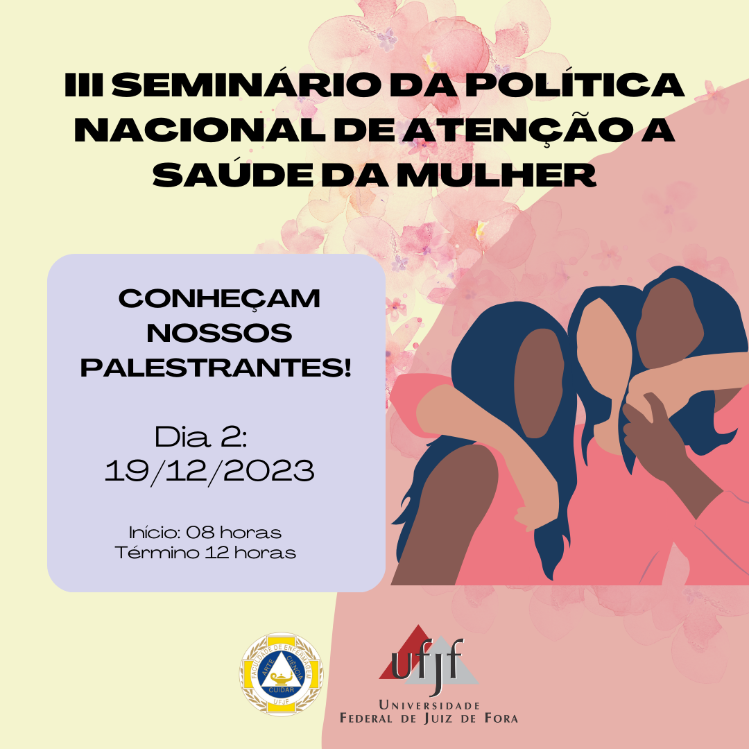 A disciplina Saúde da Mulher da Faculdade de Enfermagem/UFJF tem o imenso prazer em convidar toda a comunidade acadêmica para o “III SEMINÁRIO DA POLÍTICA NACIONAL DE ATENÇÃO A SAÚDE DA MULHER”, que ocorrerá nos dias 18 e 19 de dezembro de 2023.