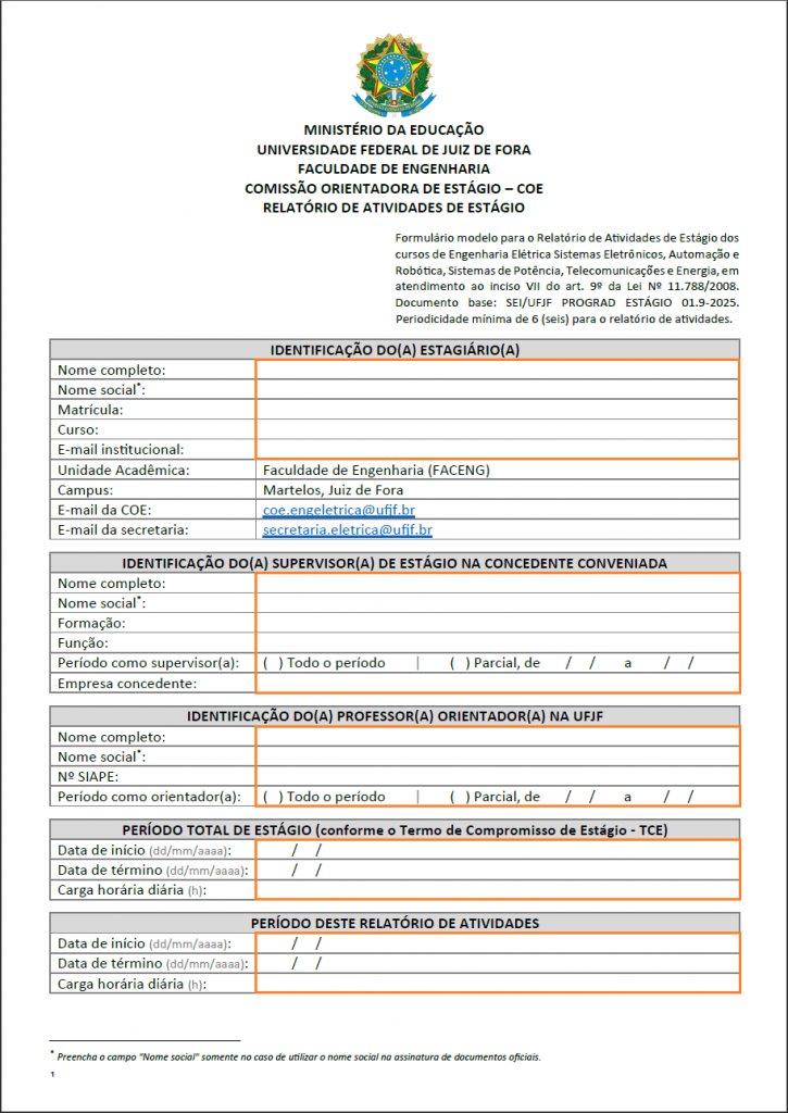 6️⃣ De posse do Relatório de Atividades de Estágio (PDF) preenchido e assinado eletronicamente pelas três partes (supervisor, estagiário e orientador), você aluno(a) deve enviar o PDF por e-mail 📧, com o assunto “[Relatório de Estágio] Nome Completo – Matrícula“, para secretaria.eletrica@ufjf.br e coe.engeletrica@ufjf.br, pedindo que seu Relatório de Atividades de Estágio (PDF) seja incluído no processo SEI-UFJF que foi criado quando você solicitou a abertura de processo de estágio na UFJF, através do formulário da COE. Uma vez que a secretaria receba o seu Relatório de Atividades de Estágio (PDF) e insira o arquivo PDF no processo SEI-UFJF correspondente, todos (você, empresa e UFJF) estão cumprindo o que determina a Lei do Estágio ✅.