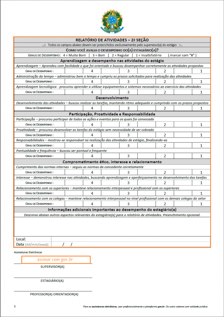 4️⃣ Após receber do supervisor o relatório preenchido e assinado, você também precisa assinar eletronicamente o PDF, utilizando preferencialmente a plataforma gov.br. Aproveite para observar como foi a avaliação do seu desempenho no estágio dada pelo supervisor.