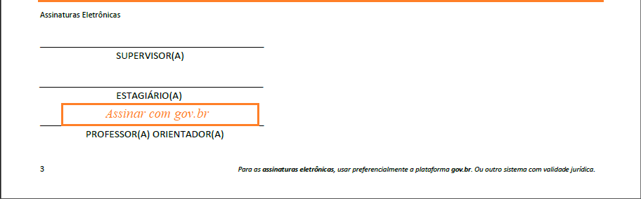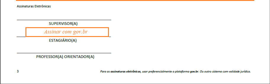 3️⃣ Passe o PDF com a página 1 preenchida ao seu supervisor de estágio na empresa, solicitando que ele(ela) preencha todos os campos das páginas 2 e 3 (destacados abaixo) e que assine eletronicamente o PDF, utilizando preferencialmente a plataforma gov.br. Peça ao supervisor que envie de volta a você o PDF após o preenchimento e a assinatura.