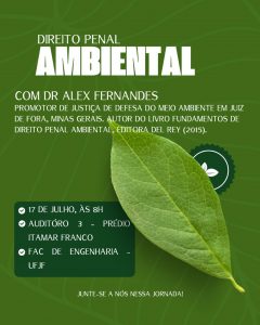 Então não perca a oportunidade de participar da nossa palestra sobre Direito Penal Ambiental, que acontecerá no dia 17 de julho de 2025, às 8h, no Auditório 3 do prédio Itamar Franco, na Faculdade de Engenharia.