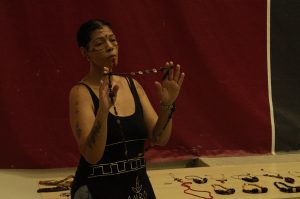 A fala de Adryana foi marcada por emoção e uma estética potente. Logo ao entrar no auditório, chamou a atenção pelos diversos acessórios artesanais que usava e havia disposto sobre uma mesa. Colares, pulseiras, fios, miçangas, sementes e ornamentos feitos por suas próprias mãos formavam uma composição que carregava sua trajetória e sua ancestralidade. Cada peça parecia reforçar fragmentos de história e identidade.