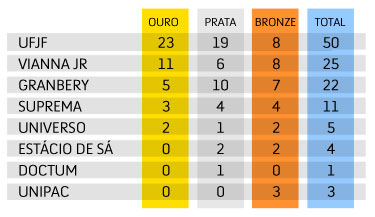 A Universidade foi oito vezes a instituição que obteve mais medalhas por modalidade na competição e dez vezes a segunda colocada, obtendo 202 pontos, recorde do evento, que teve sua primeira edição no ano passado, quando a UFJF foi vice-campeã. Neste ano, o segundo lugar ficou com o Instituto Vianna Júnior (180 pontos), que foi campeão, na edição anterior, e a terceira posição coube à equipe da Faculdade Suprema (58). De acordo com um dos diretores técnicos dos Jogos, Gilmar Quaresma, o somatório de pontos valoriza o desempenho da instituição por categoria disputada. “Aquela que teve os melhores resultados, agrupando ouro, prata e bronze, nas provas do atletismo feminino, por exemplo, é que foi melhor, e não apenas quem ganhou mais medalhas de ouro, mas não subiu ao pódio nas outras provas dessa categoria.”