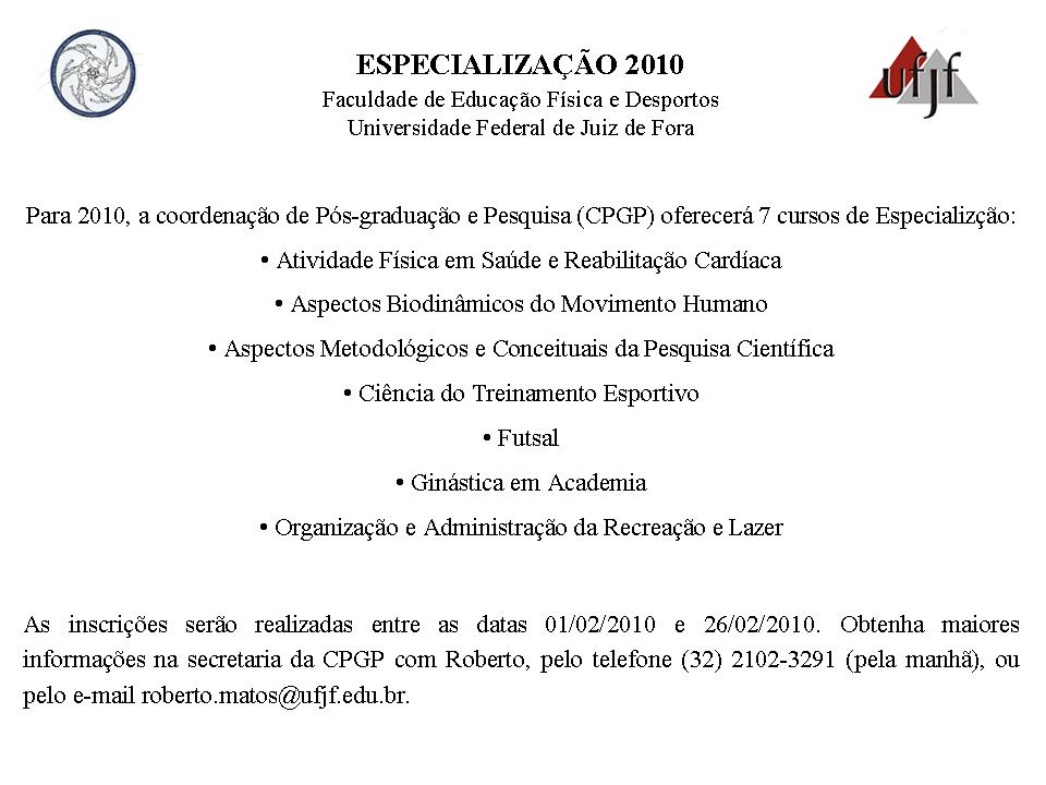 Serão oferecidos 07 cursos de Especialização em 2010. Serão os cursos de Atividade Física em Saúde e Reabilitação Cardíaca, Aspectos Biodinâmicos do Movimento Humano, Aspectos Metodológicos e Conceituais da Pesquisa Científica, Ciência do Treinamento Desportivo, Futsal, Ginástica em Academia e Organização e Administração da Recreação e Lazer. Em 2009 os cursos oferecidos pela Coordenação de Pós-graduação foram um sucesso e no próximo ano espera-se um sucesso maior, ja que 2010 será o ano da nova Faefid, com a inauguração das novas instalações.
