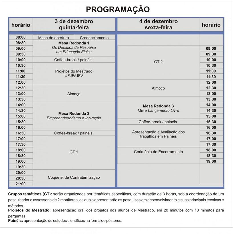 Além da realização de palestras, mesas redondas e painéis haverá apresentação de trabalhos de conclusão de curso por alunos do 8º período de habilitação em bacharel em Educação Física e de dissertações dos alunos de Mestrado. Neste ano, o evento conta com uma novidade: a organização optou por trocar as oficinas pelos Grupos Temáticos (GTs). “Acredito que os GTs são mais eficazes ao passar conhecimento. Nas oficinas, não existe a participação pró-ativa proporcionada pelos GTs, em que os participantes, professores e pesquisadores realizam um contato direto através de um diálogo constante”, ressalta José Marques.