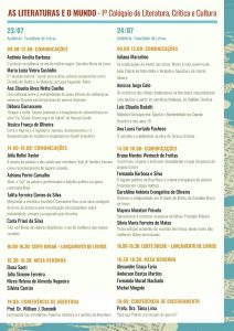 O 1° Colóquio de Literatura, Crítica e Cultura: As Literaturas e o Mundo é um evento organizado pelxs professores da Linha de Pesquisa Literatura, Crítica e Cultura do Programa de Pós-graduação em Letras: Estudos Literários da Faculdade de Letras. O Colóquio procura tanto a divulgação das pesquisas de seus professores e de alguns dxs seus orientandes, como a discussão interna, a avaliação e atualizaçâo dos seus conteúdos.