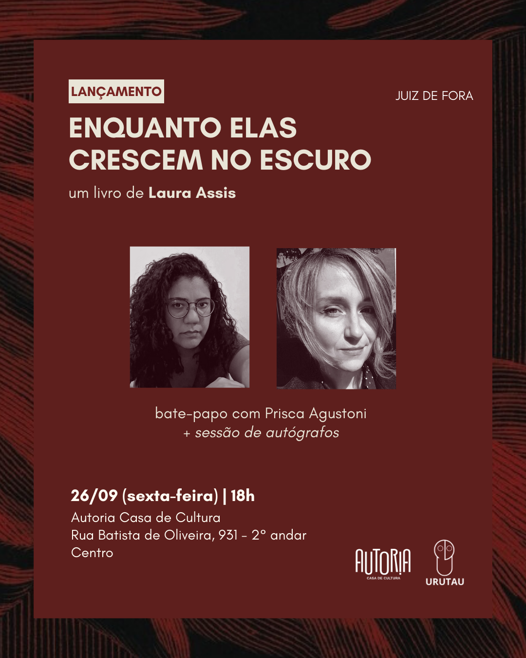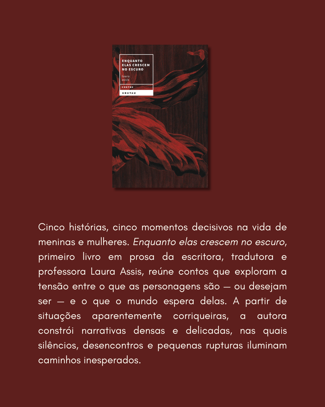 Cinco histórias, cinco momentos decisivos na vida de meninas e mulheres. Enquanto elas crescem no escuro, primeiro livro em prosa da escritora, tradutora e professora Laura Assis, reúne contos que exploram a tensão entre o que as personagens são — ou desejam ser — e o que o mundo espera delas. A partir de situações aparentemente corriqueiras, a autora constrói narrativas densas e delicadas, nas quais silêncios, desencontros e pequenas rupturas iluminam caminhos inesperados. O lançamento acontece nesta sexta-feira, 26, às 18h, na Autoria Casa de Cultura, e contará com um bate-papo entre a autora e a professora da Faculdade de Letras da Universidade Federal de Juiz de Fora (UFJF), Prisca Agustoni.