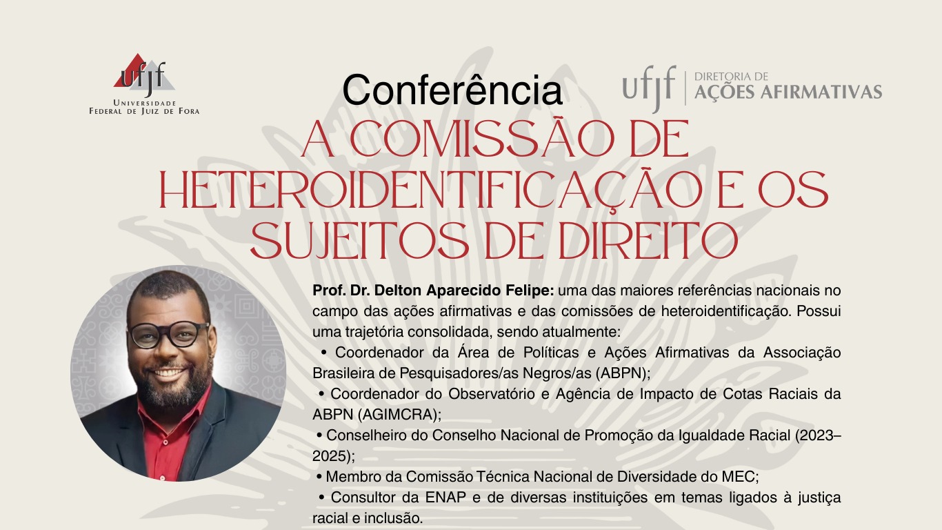 A Diretoria de Ações Afirmativas da UFJF convida todas e todos para a conferência “A Comissão de Heteroidentificação e os Sujeitos de Direito”, com o Prof. Dr. Delton Aparecido Felipe, referência nacional nas políticas de cotas raciais e comissões de heteroidentificação.