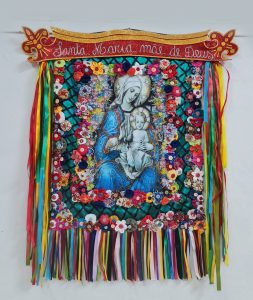 Um dos destaques da mostra é o estandarte do Divino Espírito Santo, emblemático por trazer ao público a representação do padroeiro de Guarani. A tonalidade do tecido escolhido denota a naturalidade típica destes trabalhos; a figura do pássaro, representativo da santidade, traz ao seu redor miçangas, pompons, fitas de cetim e fuxicos que dão o toque singular a esta obra que congrega técnicas tão preciosas e representativas do artesanato mineiro.
