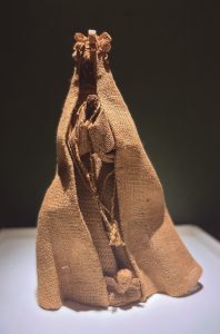 Chama a atenção ainda, a imagem de Nossa Senhora Aparecida, criada em saco de aniagem, pelo artista Expedito. A obra reforça as infinitas possibilidades criativas que nascem a partir da visão do artesão diante de materiais que, muitas vezes, poderiam ser descartados. Admirar a peça, com sua estrutura preciosa e uma matéria-prima diferenciada, permite interpretações e experiências múltiplas aos visitantes.