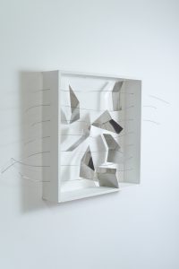 Além da estética metálica, Marilda Rezende também buscou na cor branca – sendo ela a união de todas as cores – a tonalidade que interferisse minimamente nos metais e, ao mesmo tempo, conseguisse destacar seu volume e sombras. Tintas p.v.a., de esmalte sintético, acrílico em branco neve, branco gelo, off white foram algumas das opções escolhidas.