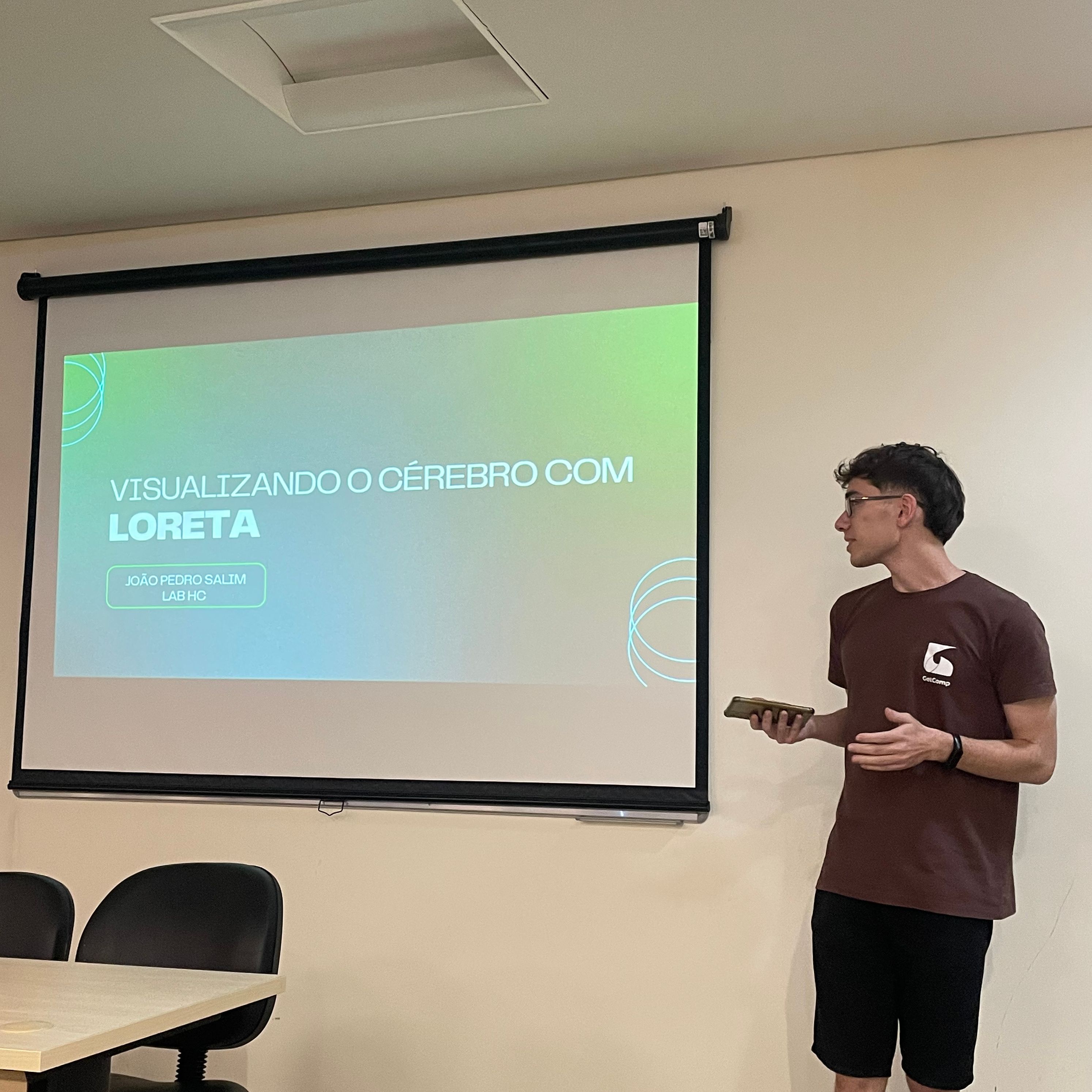 Apresentei o começo da minha pesquisa sobre visualização cerebral, utilizando EEG e algoritmos do LORETA. Na apresentação, trouxe detalhes de como o problema era modelado matematicamente para calcular o mapa 3D da atividade do cérebro, como a álgebra é importante para essa pesquisa e as vantagens de obter uma tomografia de baixa resolução com um equipamento mais barato.