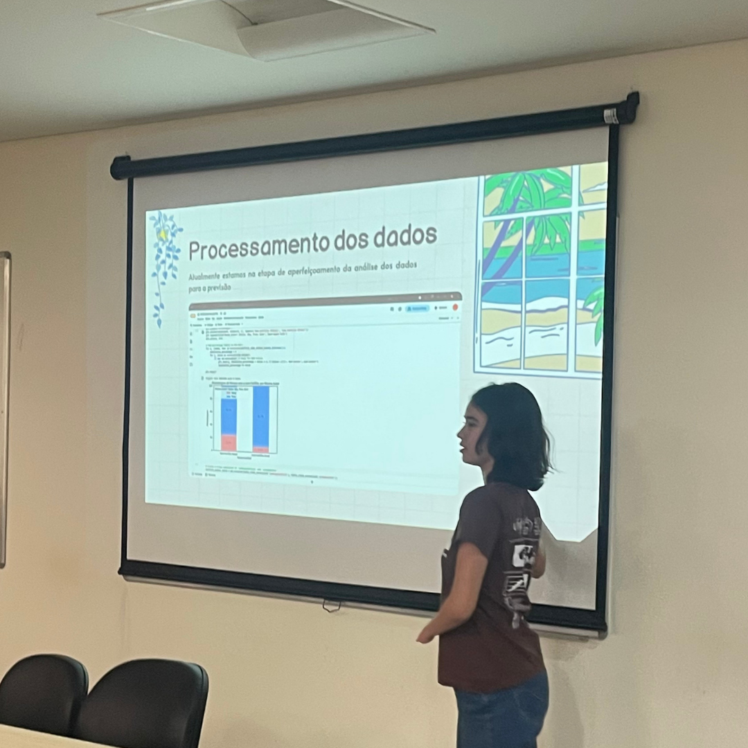 Apresentei minha pesquisa sobre indicadores de tempo de resolução de conflitos em merge de software. Na apresentação, primeiro expliquei o que é Git e conflito de merge, além de destacar como a pesquisa é relevante para o desenvolvimento de software. Depois, expliquei como foram implementados os códigos de coleta de dados de repositórios e de análise de dados.