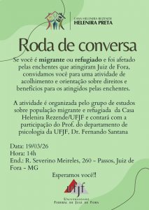 A atividade é organizada pelo grupo de estudos sobre população migrante e refugiada da Casa Helenira Rezende/UFJF e contará com a participação do Prof. do departamento de psicologia da UFJF, Dr. Fernando Santana