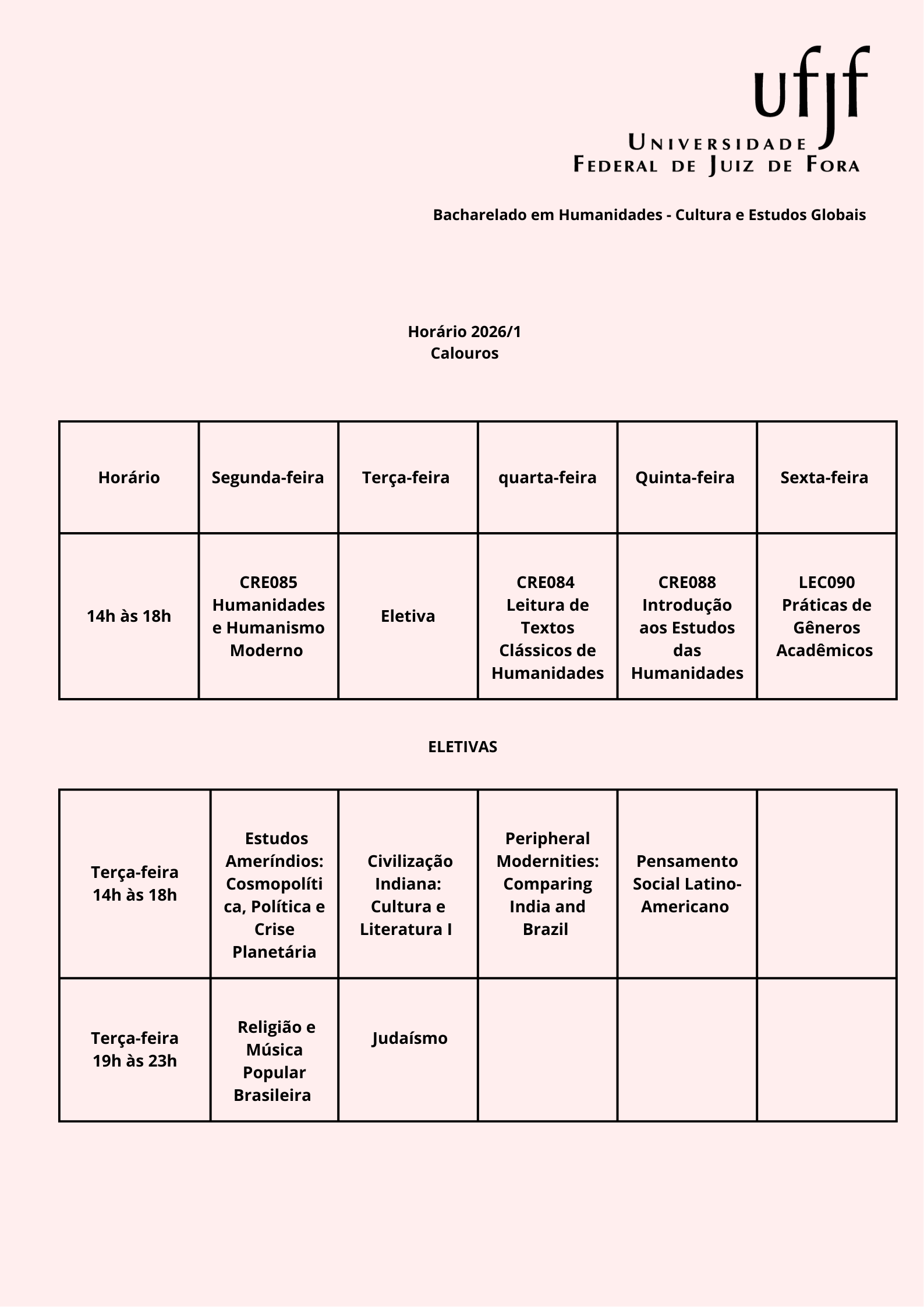 Horários do semestre 2026.1