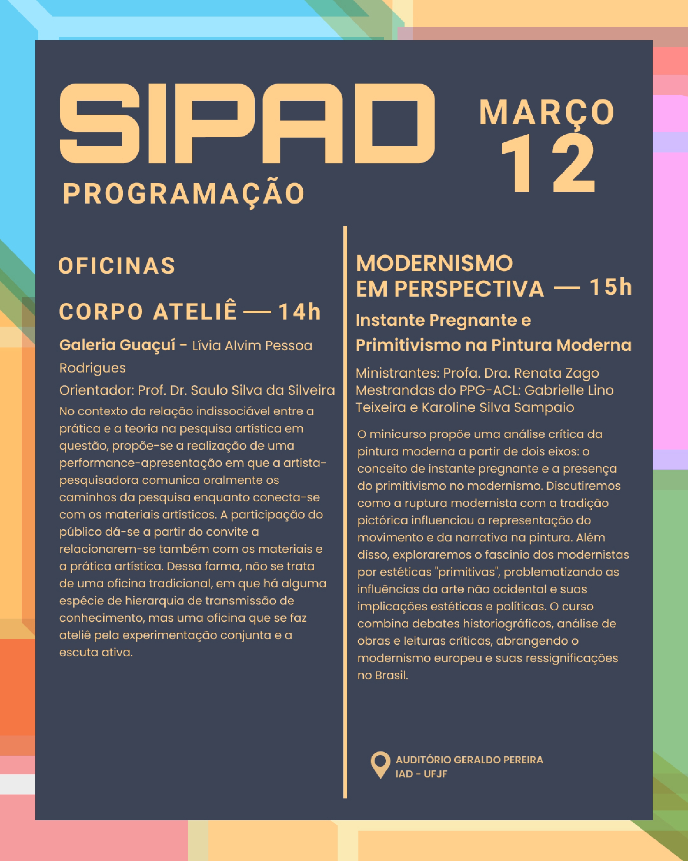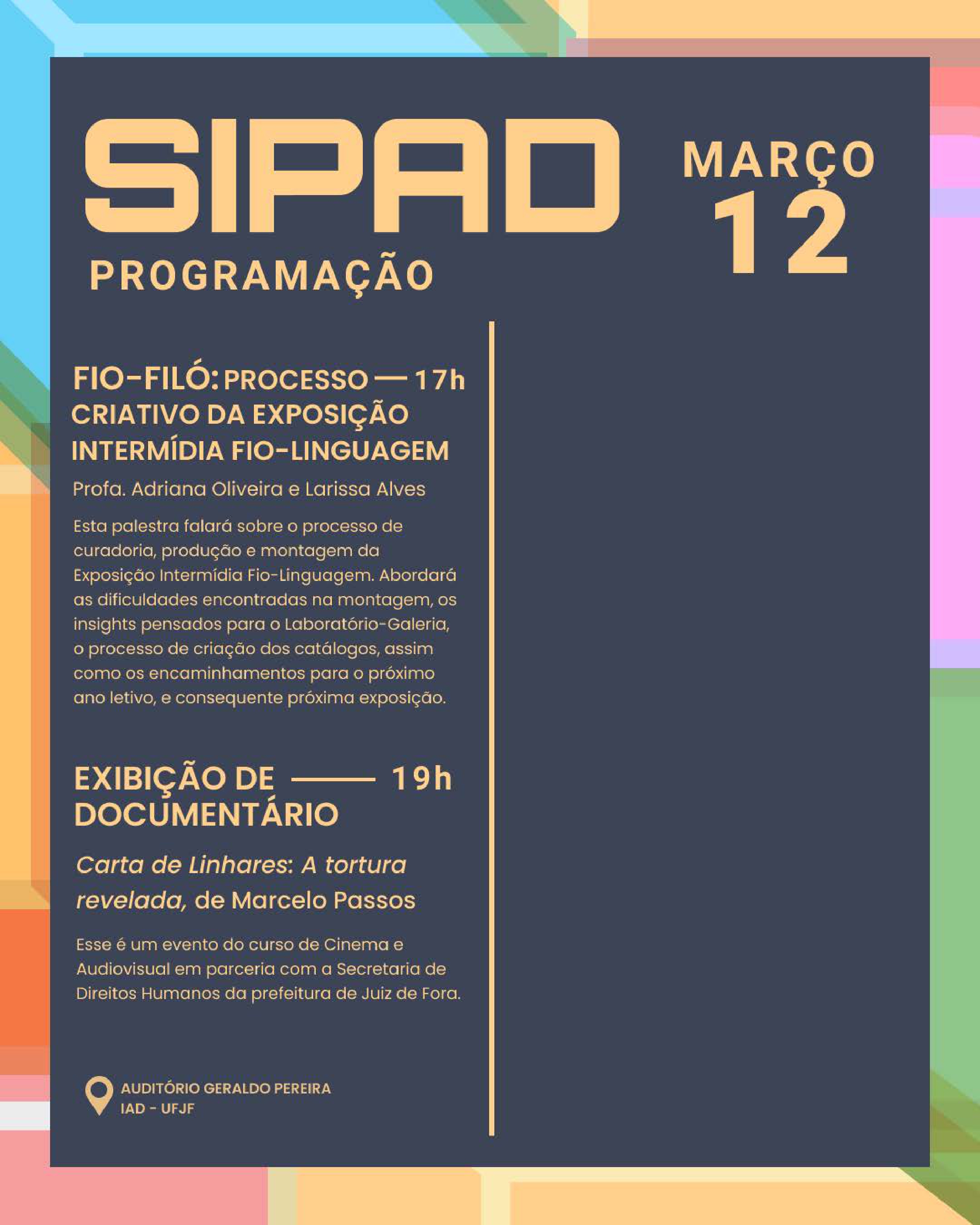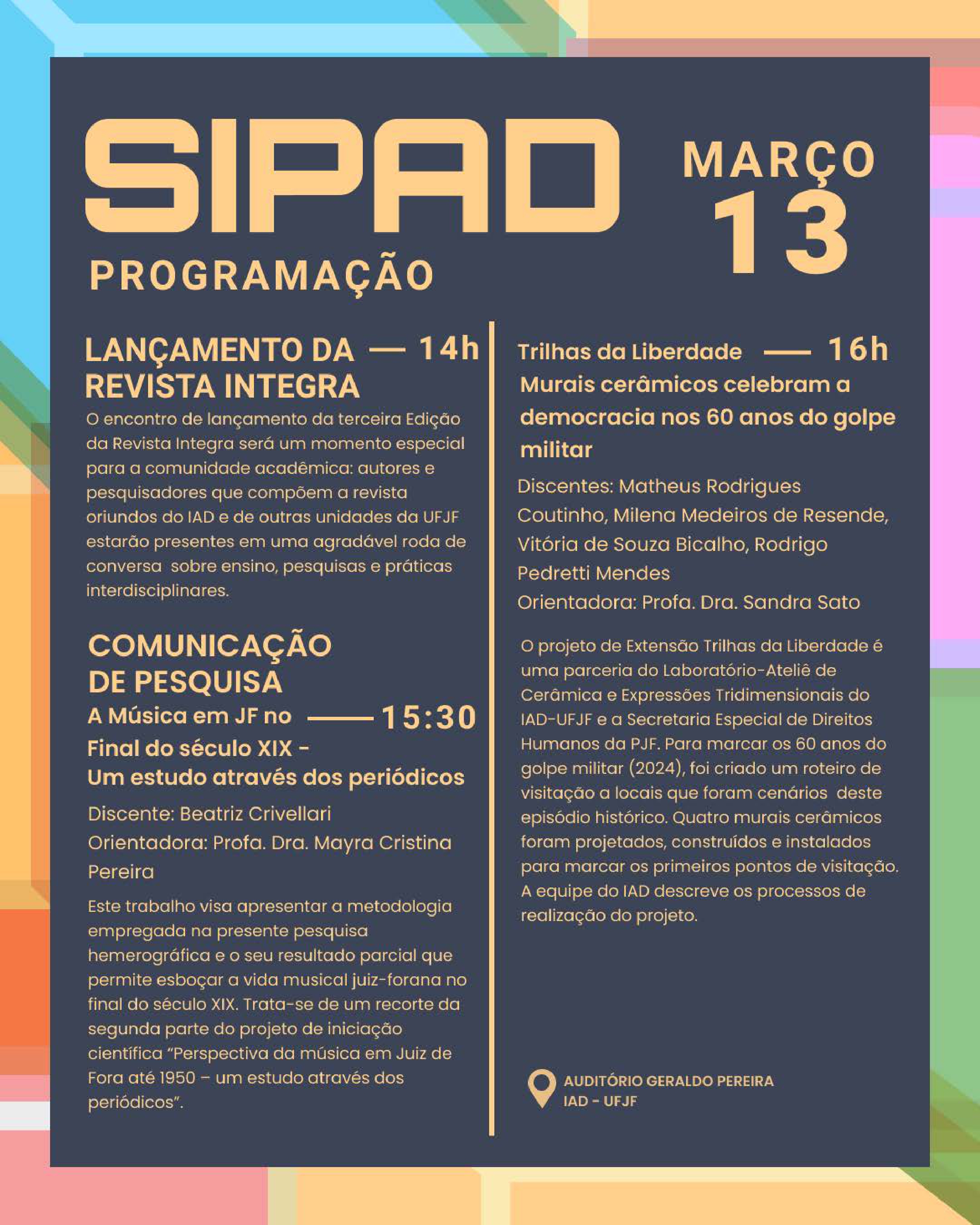 O Seminário Interno de Pesquisas do IAD, evento anual em que são apresentados e discutidos trabalhos e pesquisas realizados no IAD, ocorreu, numa singela troca, em outras unidades da UFJF, destacando-se o caráter interdisciplinar da ARTE e DAS DIVERSAS ÁREAS CRIATIVAS que compõem nosso instituto.