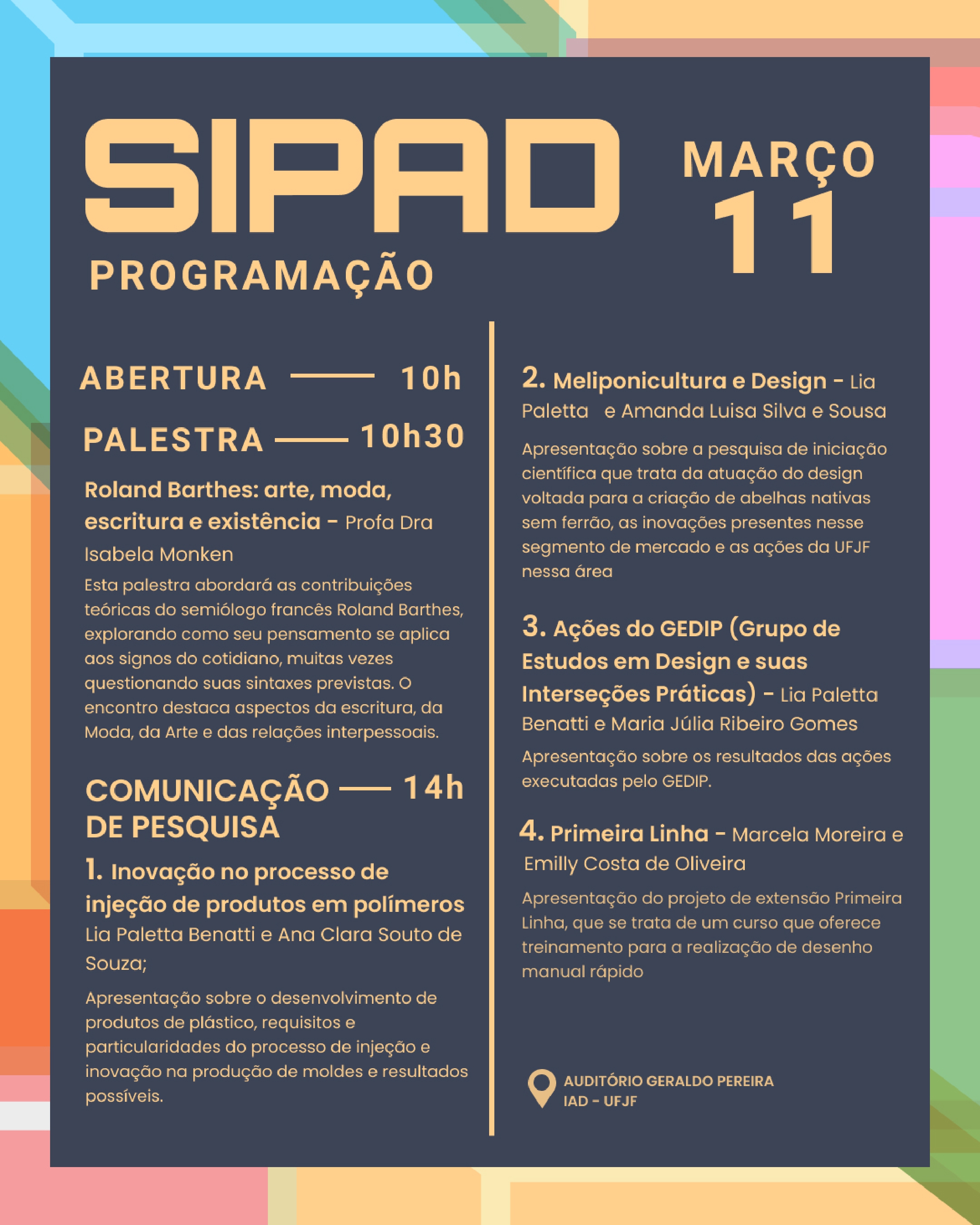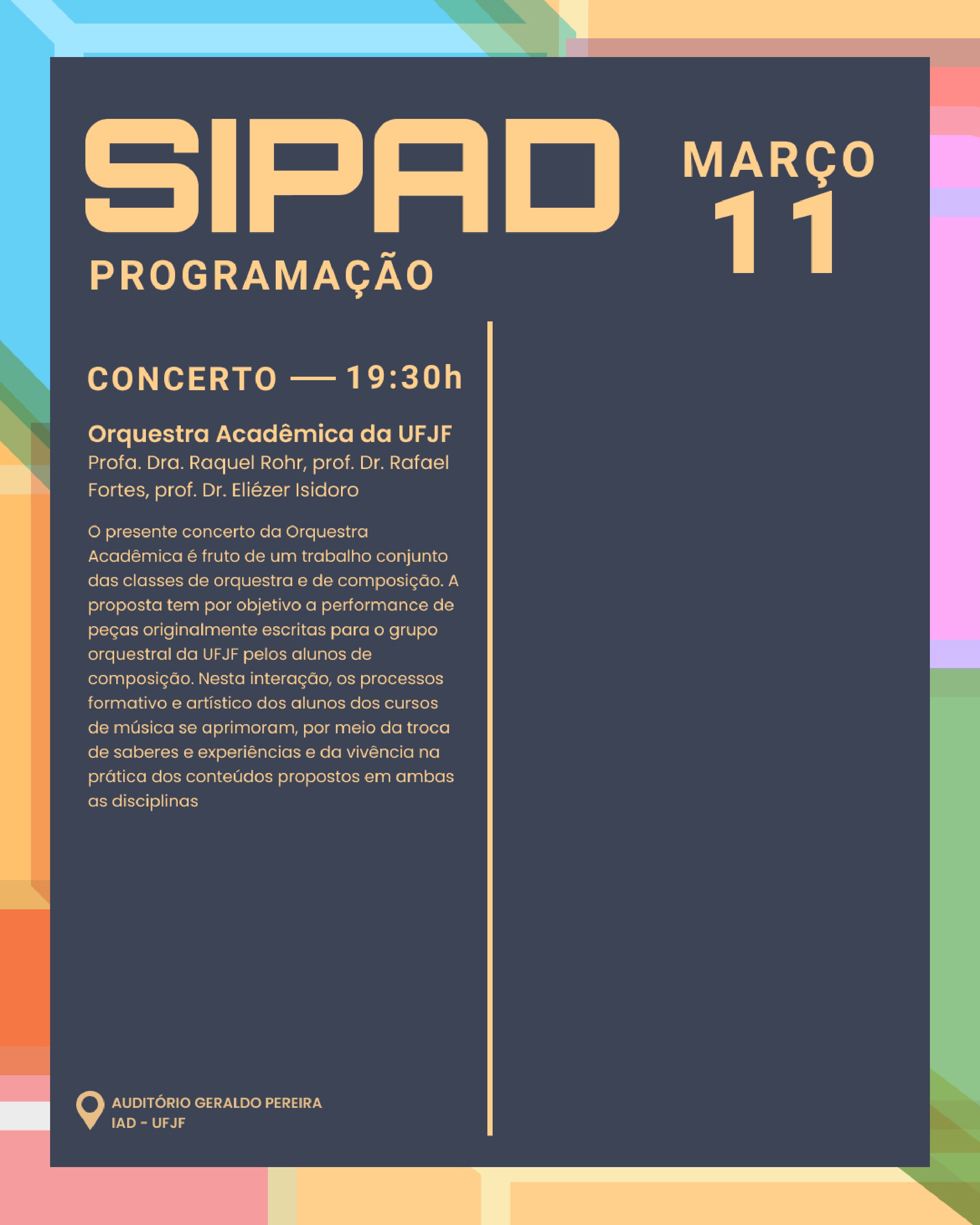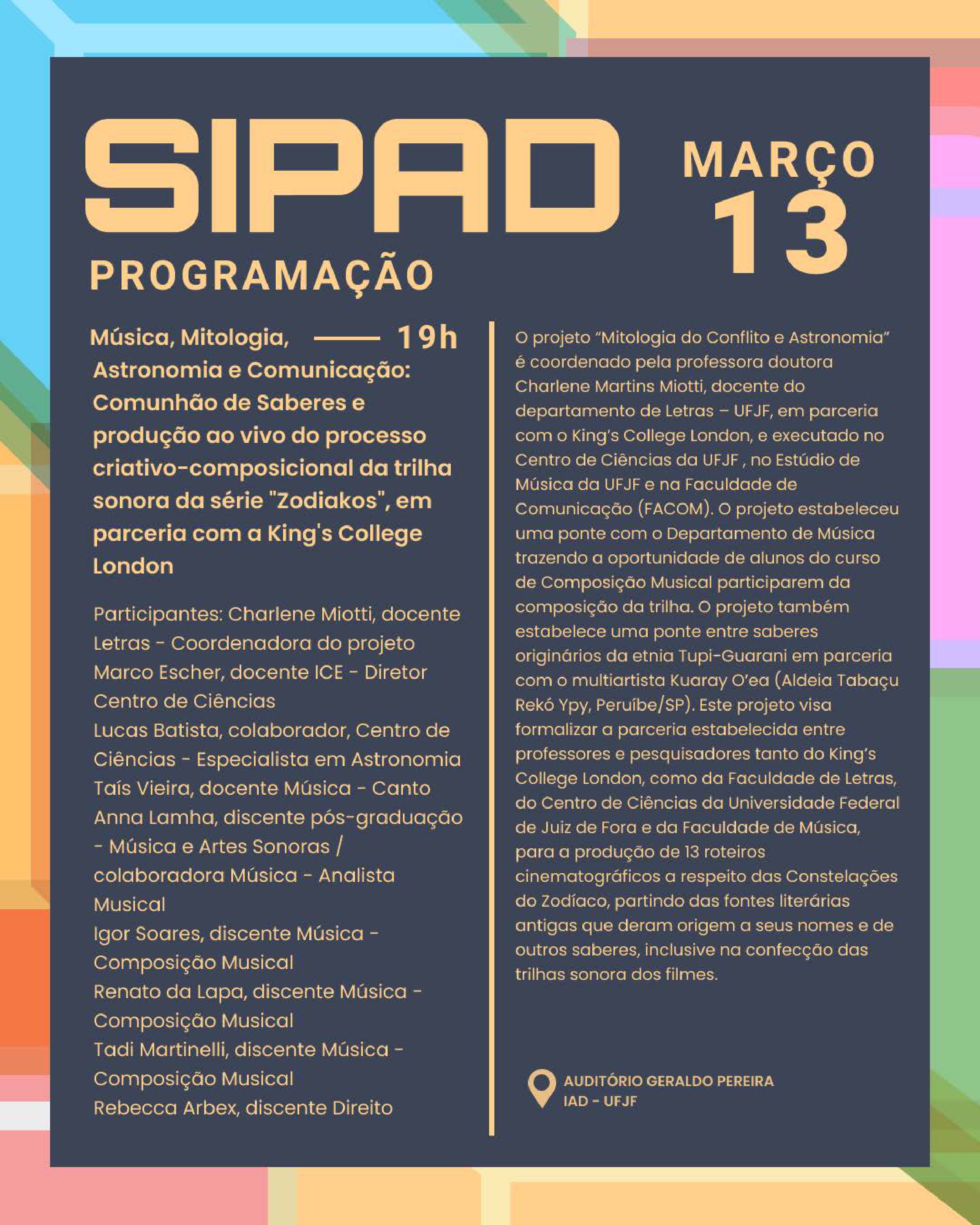 O Seminário Interno de Pesquisas do IAD, evento anual em que são apresentados e discutidos trabalhos e pesquisas realizados no IAD, ocorreu, numa singela troca, em outras unidades da UFJF, destacando-se o caráter interdisciplinar da ARTE e DAS DIVERSAS ÁREAS CRIATIVAS que compõem nosso instituto.