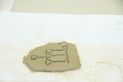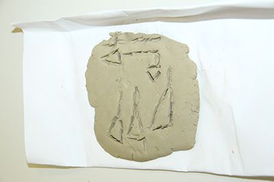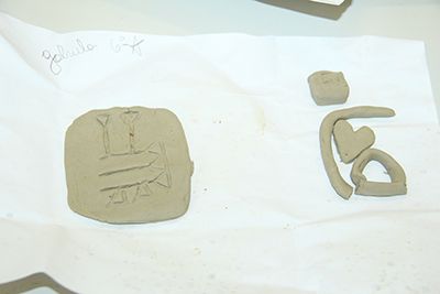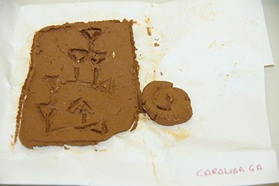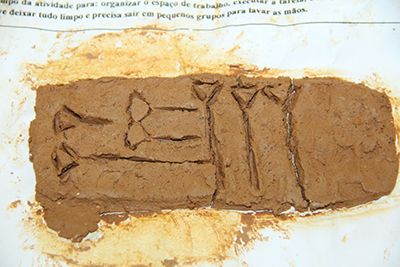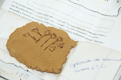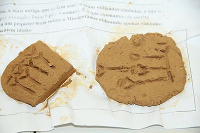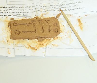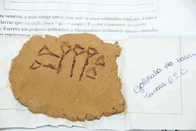 Fazendo uso de argila, palitos e criatividade, as turmas dos 6º anos A, B e C, produziram, em sala de aula, uma representação da escrita cuneiforme.