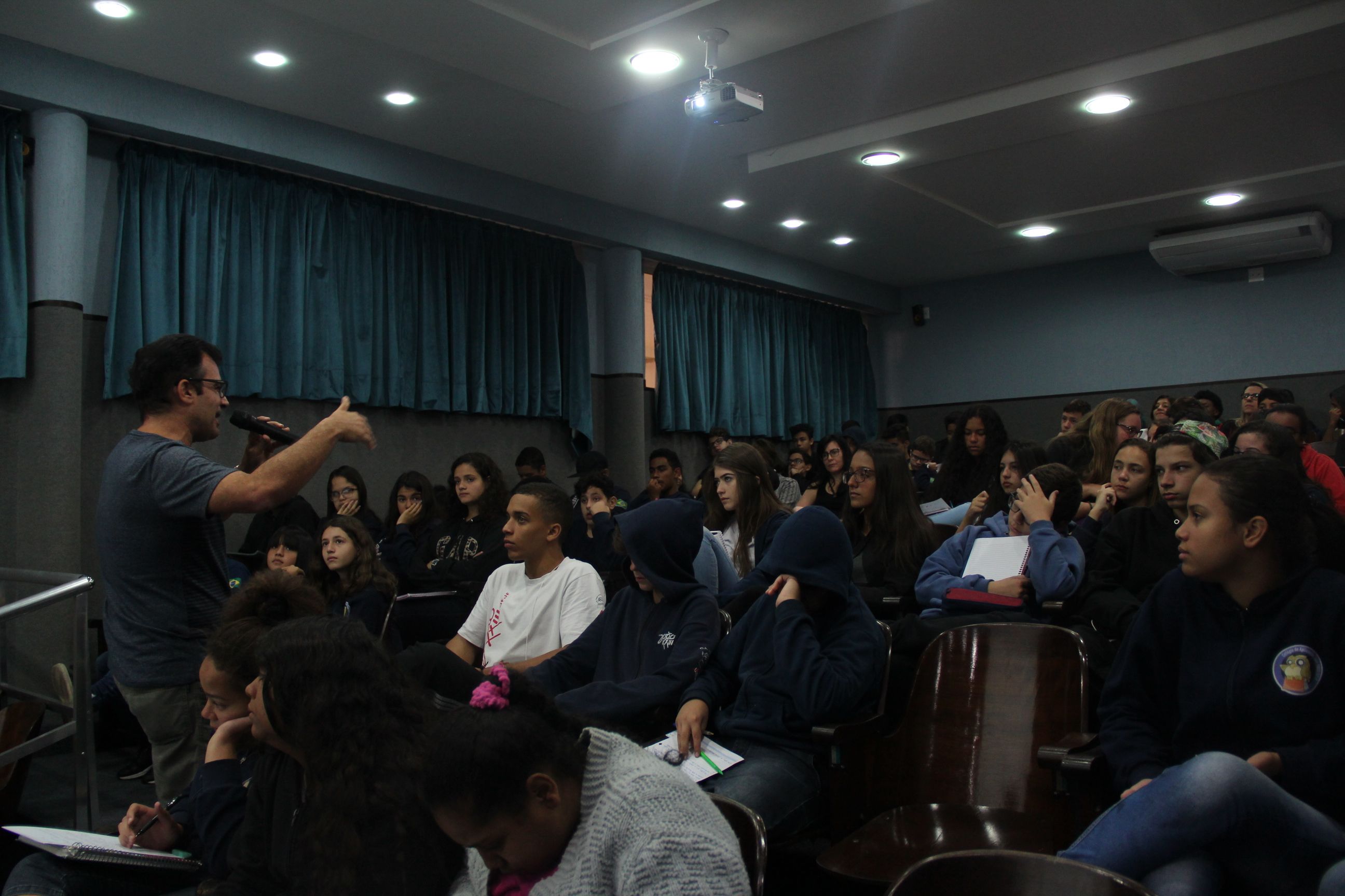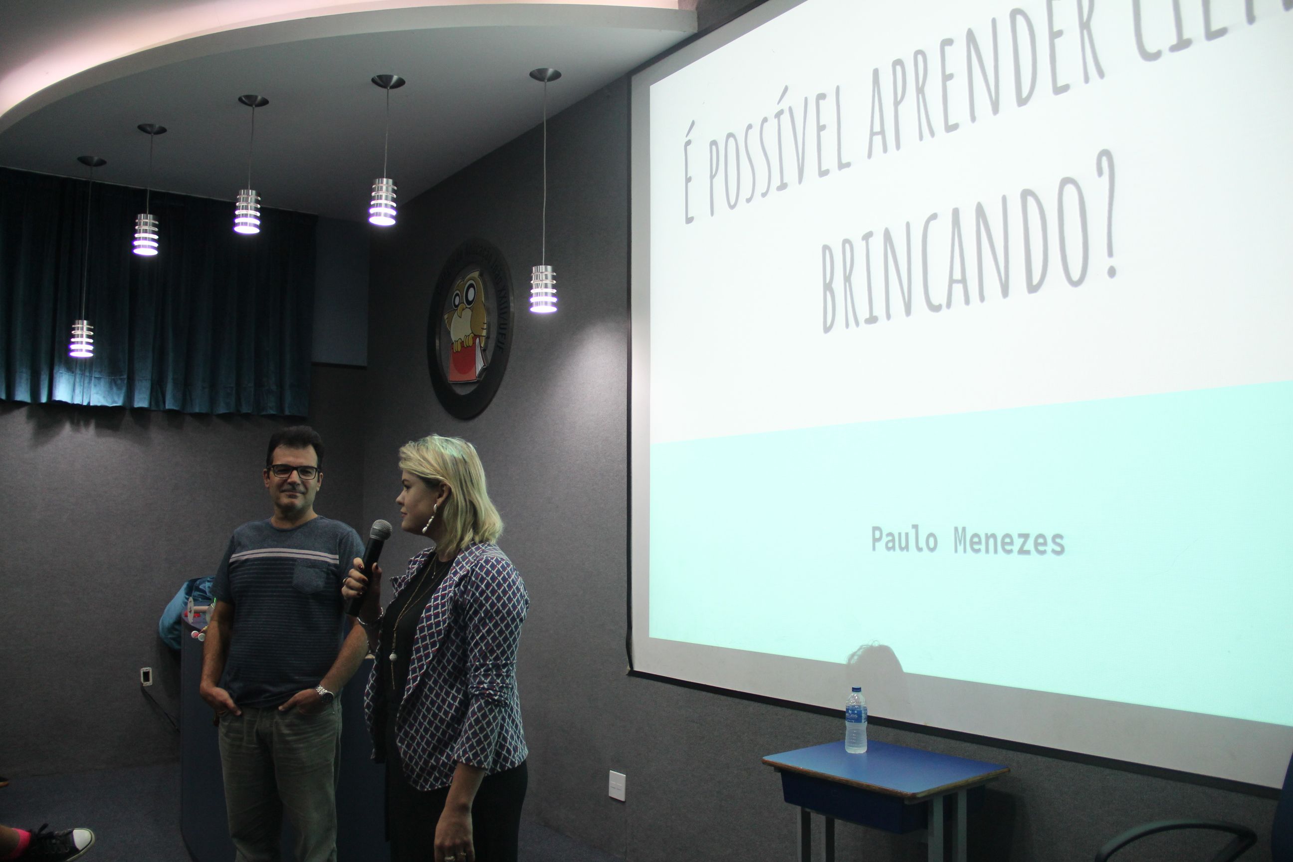 Na sexta-feira (11/05), o professor Paulo Henrique Menezes, trouxe brinquedos científicos feitos com materiais reutilizados capazes de explicar de forma lúdica os experimentos da física. Para a professora Fernanda Bassoli, que coordenou a palestra, a importância de mostrar aos jovens que a ciência é acessível através de relatos como o dele é fundamental: “Normalmente é construída uma imagem de cientista muito estereotipada, associada a pessoas excêntricas. O relato do pesquisador é muito importante para humanizar e romper com essa ideia que o cientista é uma pessoa fora do comum”, afirma a professora.