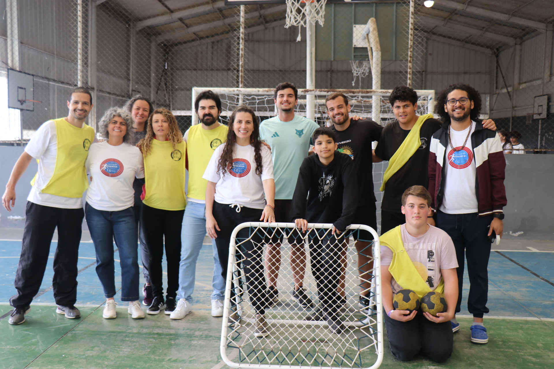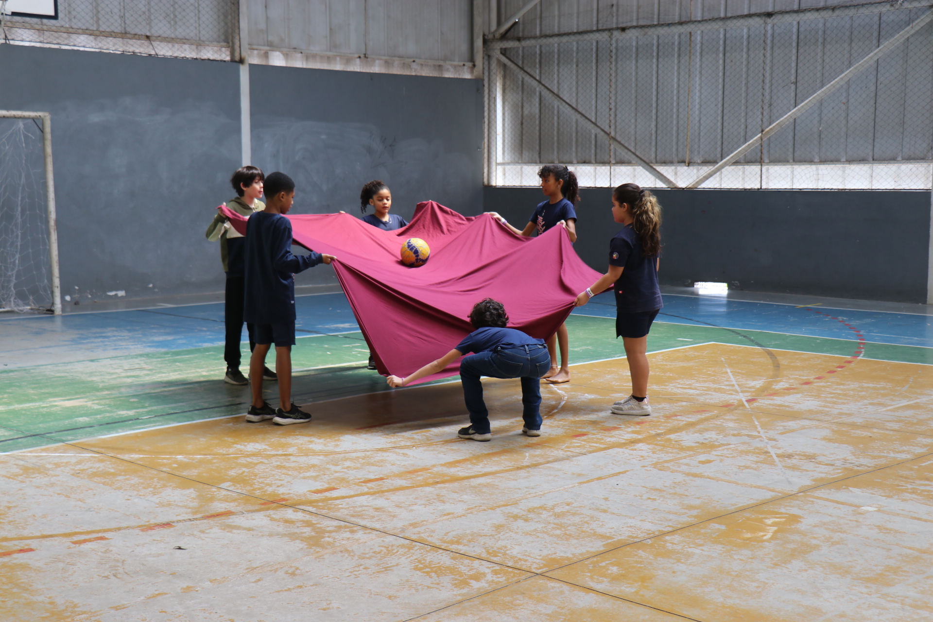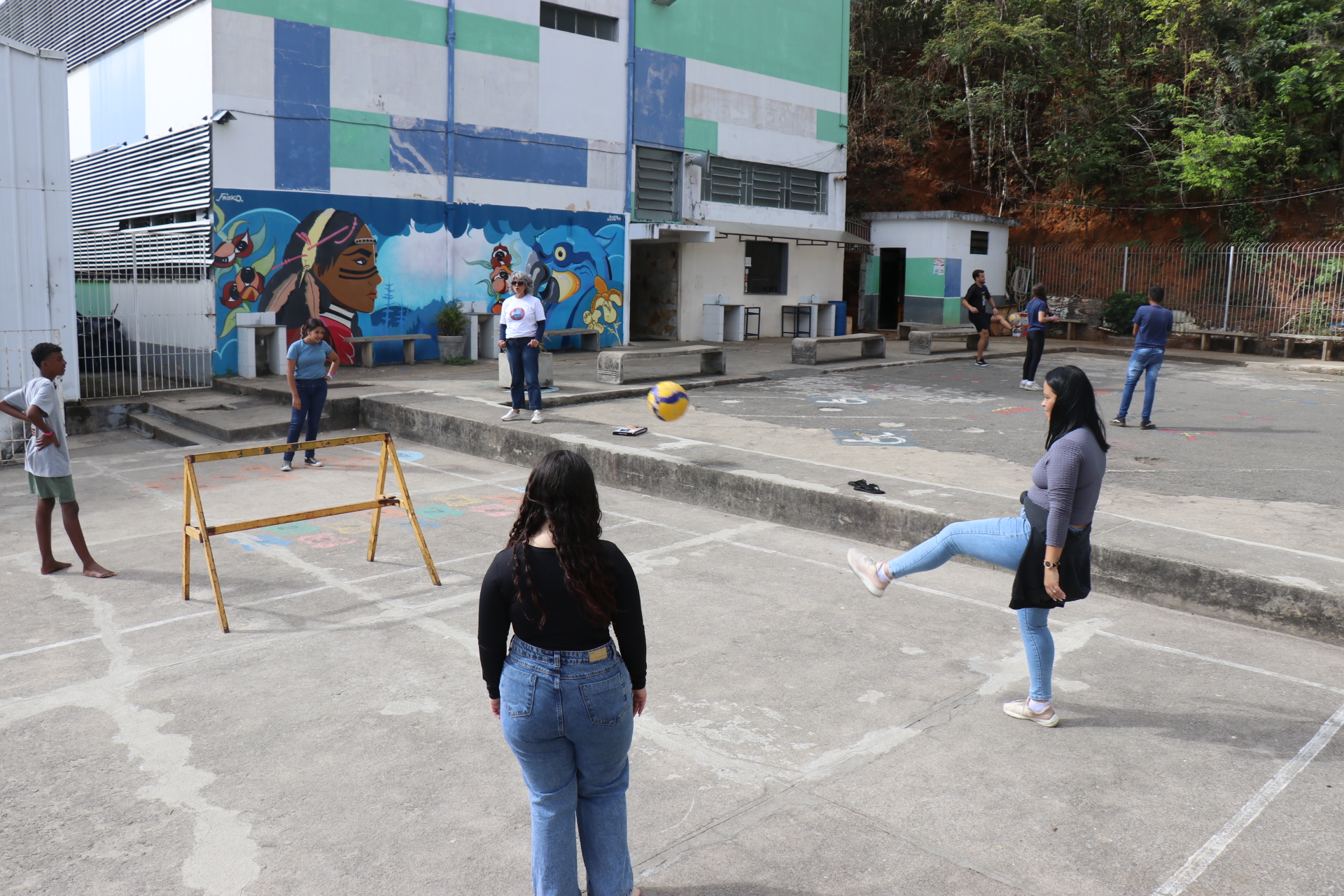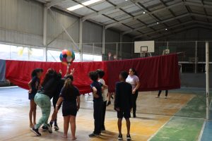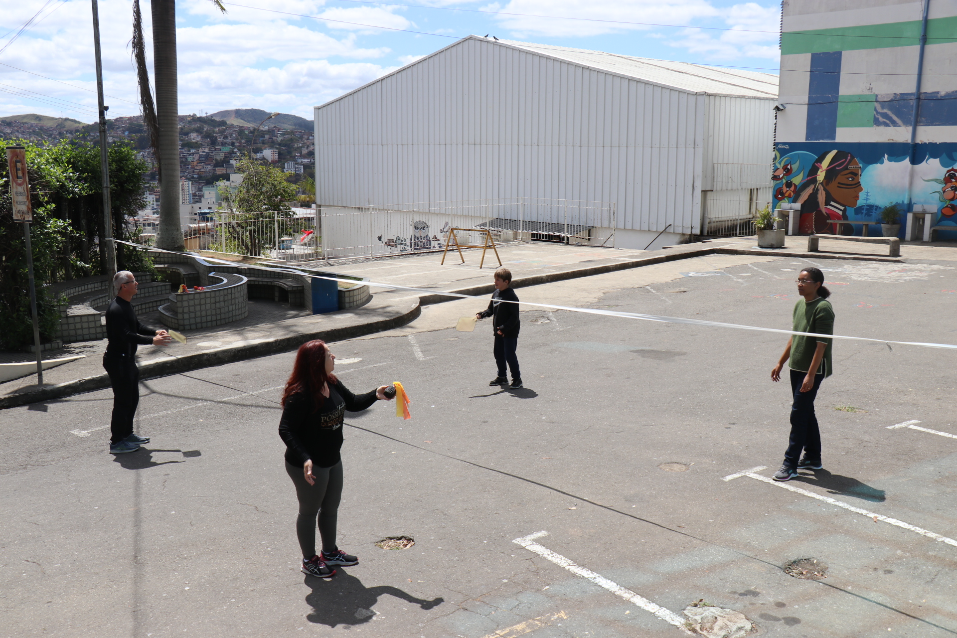 Uma oficina sobre vôlei e variações buscou proporcionar conhecimento acerca da modalidade esportiva, partindo da compreensão da sua história, passando de vivências na dimensão do jogo à modalidade enquanto esporte. “Nessa perspectiva, a ludicidade foi preponderante, com a utilização de materiais alternativos que proporcionaram desafios diversos aos estudantes e famílias”, explica Eliete. A oficina contou com as seguintes atividades: vôlei com tecido (lençol); vôlei bloqueado (rede coberta com tecido, impedindo a visualização da outra quadra); e o vôlei com as regras universais. Em todas, o desafio foi centrado na ação coletiva, colaborativa e inclusiva.