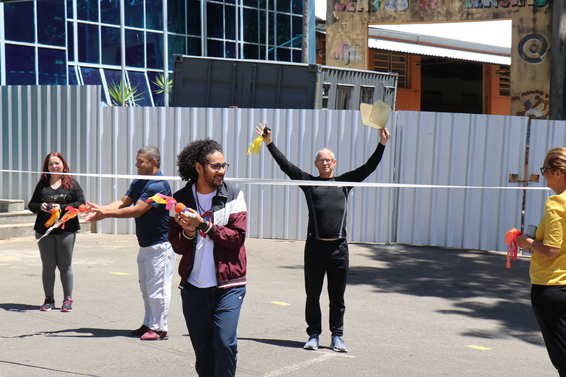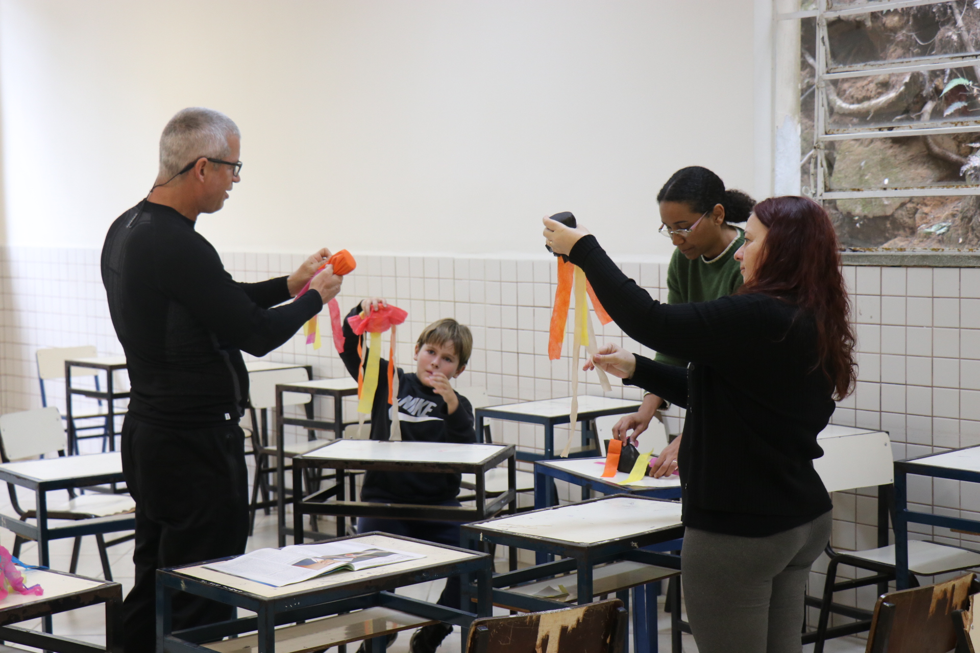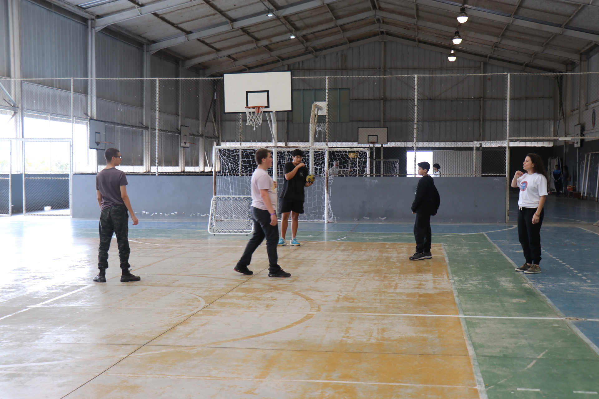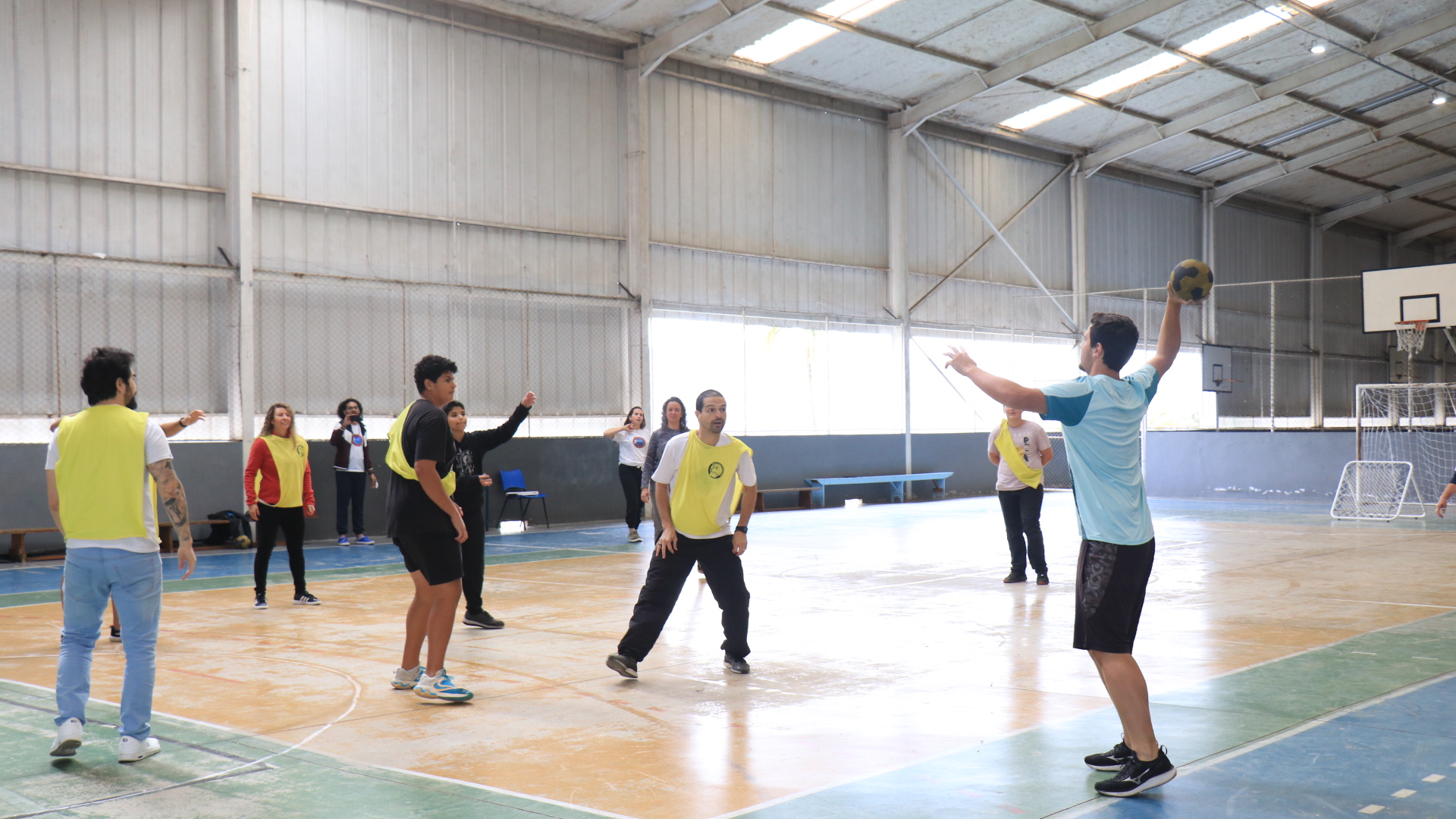Uma oficina sobre vôlei e variações buscou proporcionar conhecimento acerca da modalidade esportiva, partindo da compreensão da sua história, passando de vivências na dimensão do jogo à modalidade enquanto esporte. “Nessa perspectiva, a ludicidade foi preponderante, com a utilização de materiais alternativos que proporcionaram desafios diversos aos estudantes e famílias”, explica Eliete. A oficina contou com as seguintes atividades: vôlei com tecido (lençol); vôlei bloqueado (rede coberta com tecido, impedindo a visualização da outra quadra); e o vôlei com as regras universais. Em todas, o desafio foi centrado na ação coletiva, colaborativa e inclusiva.