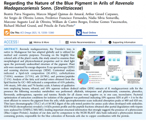 O artigo estuda os arilos azul-intensos das sementes de Ravenala madagascariensis (árvore-do-viajante), descrevendo suas características morfológicas e físico-químicas e identificando a natureza do pigmento responsável pela cor. As análises mostraram que os arilos são majoritariamente lipídicos, com presença menor de proteínas, carboidratos e umidade, e praticamente sem metabólitos secundários clássicos. A extração e caracterização espectroscópica e proteômica indicaram que o pigmento azul não é um corante vegetal comum, mas sim uma proteína cúprica de cerca de 14 kDa, do tipo fitocianina, cuja coloração resulta da coordenação de cobre com a estrutura proteica.