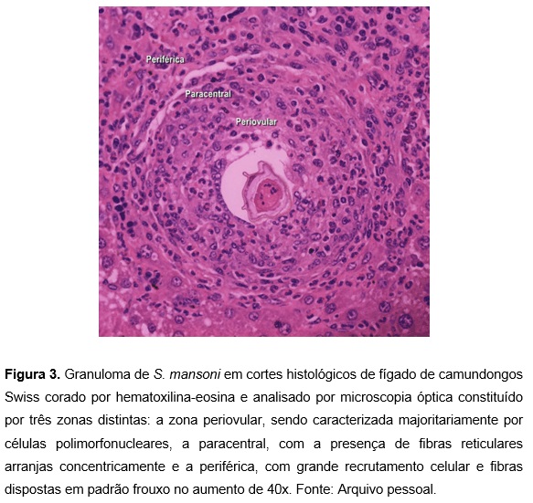 Algumas células formam “pontes” do ovo ao endotélio, e penetram então através da parede do vaso criando uma pequena bainha perivenular e, posteriormente, o número de células infiltradas aumenta e se difunde intensamente para o tecido perivascular, sendo quimioatraídas, juntamente com as células, para os sinusóides do fígado ou outros vasos adjacentes, formando um conjunto frouxo de várias células exsudativas com dimensões que podem atingir cinco vezes o tamanho do ovo6.